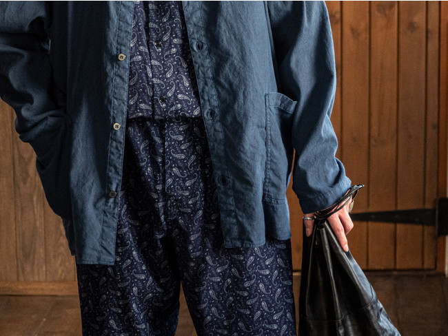 抜染のなかでも特に熟練した技術を必要とする、“あえて完全に色を抜ききらない”加工「半抜染」を施すことによって、一つひとつに濃淡差や輪郭差のあるインディゴペイズリーが完成。