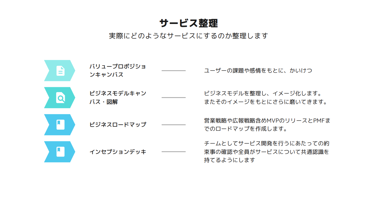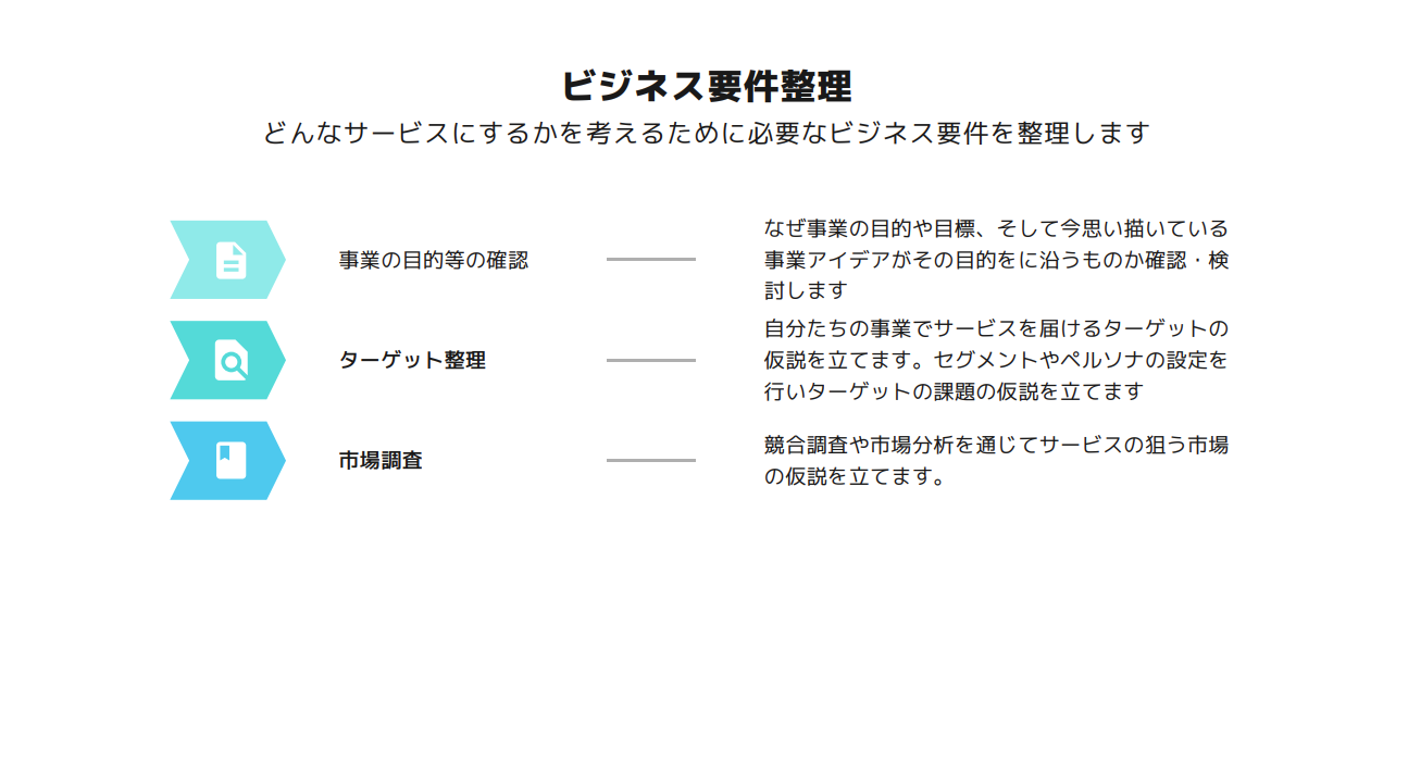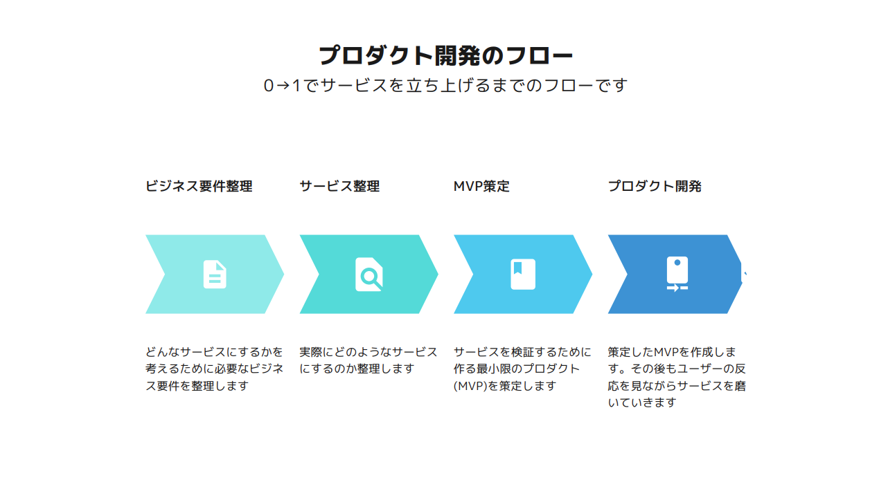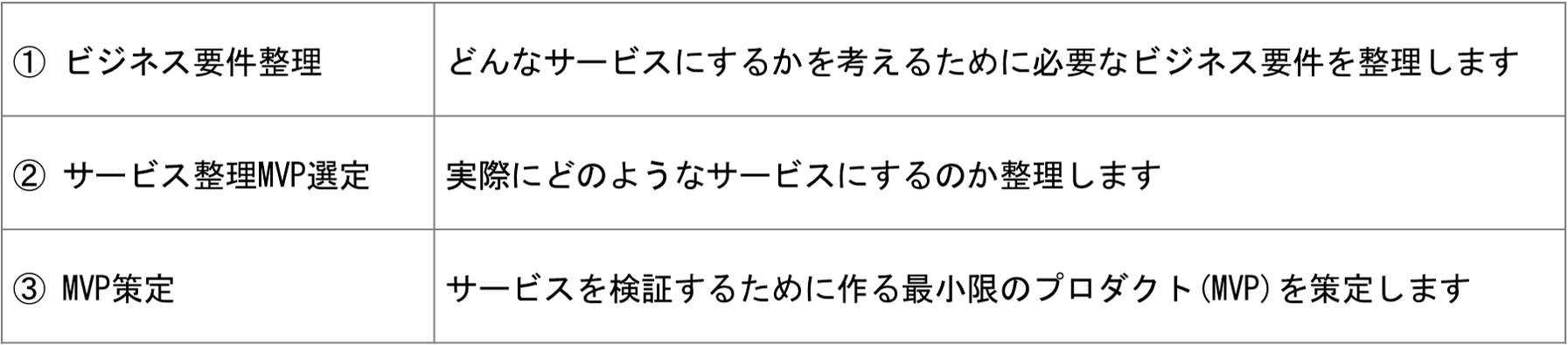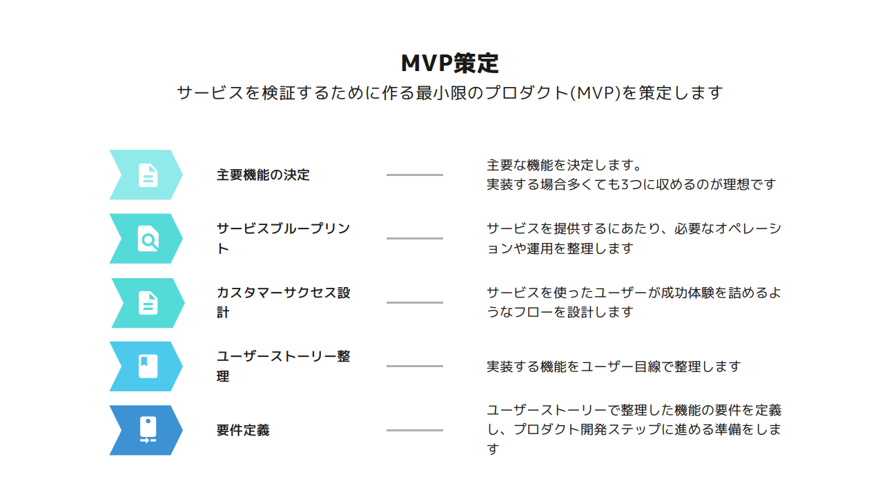 すべてのサービスに開発が必要という訳ではありませんが、顧客のニーズを満たす最小限のプロダクトのことを(MVP: MinimumViable Product)と呼び、まずはMVPを作ることで最小限のコストでサービスの検証をすることができます。