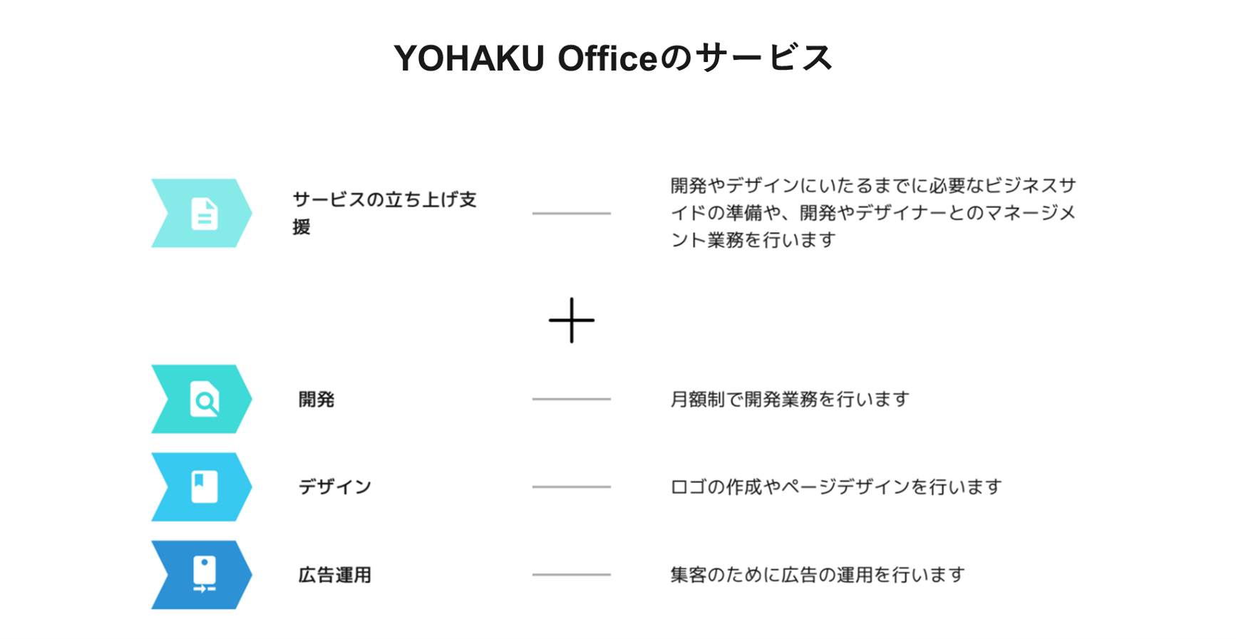 これまで、企画から、クリエイティブ、ブランディング、集客までをノンストップでサポートするブランドマーケティングサービスを提供しておりましたが、この度、お客様のサービスアイデアを一緒に磨き、立ち上げ、運用していくビジネスモデル構築から携わるWEBサービスの立ち上げサービス『YOHAKU BizDev』の提供を新たに開始いたします。