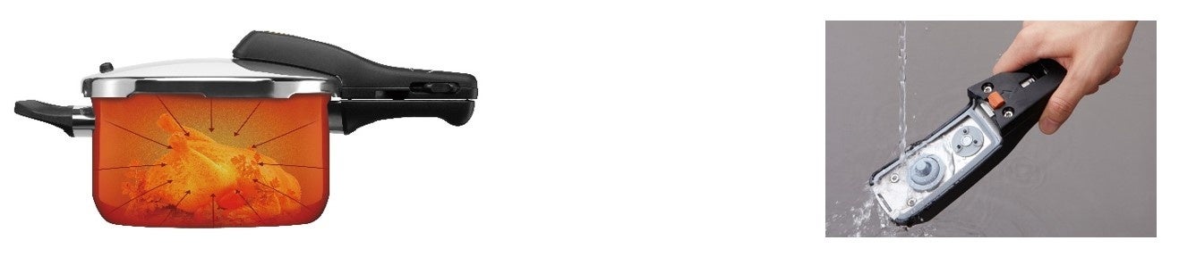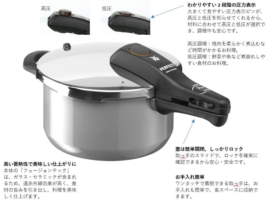 蓋は、取っ手のスライドでロックを確実に確認でき、安心・安全です。さらに大きくて見やすい圧力表示ピンが、高圧と低圧を分かりやすく知らせてくれるから、調理中も安心してお使いいただけます。高圧は塊肉を柔らかく煮込むなど時間がかかる料理に、低圧は野菜など煮崩れせずに仕上げることができます。WMF独自のワンタッチで着脱できる取っ手は、ボタンを押し下げるだけで蓋から取っ手を簡単に取り外すことができるので、洗いやすくいつでも清潔に保つことができるとともに、省スペースでの収納もかなえます。温かい煮込み料理が美味しくなるこれからの季節、美味しさと使いやすさを追究した「フュージョンテック圧力鍋 4.5L PL」は、毎日の料理にお使いいただけます。また、上質なシックなカラーと高いデザイン性がどんなキッチンにも調和し、料理の時間を特別なものにしてくれます。
