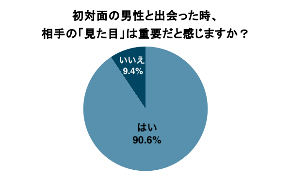 「初対面の男性と会ったとき、相手の『見た目』は重要だと感じますか?」と質問したところ、「はい」と回答した方は90.6%となり、9割以上の方が初対面では見た目の印象を重視していることがわかりました。