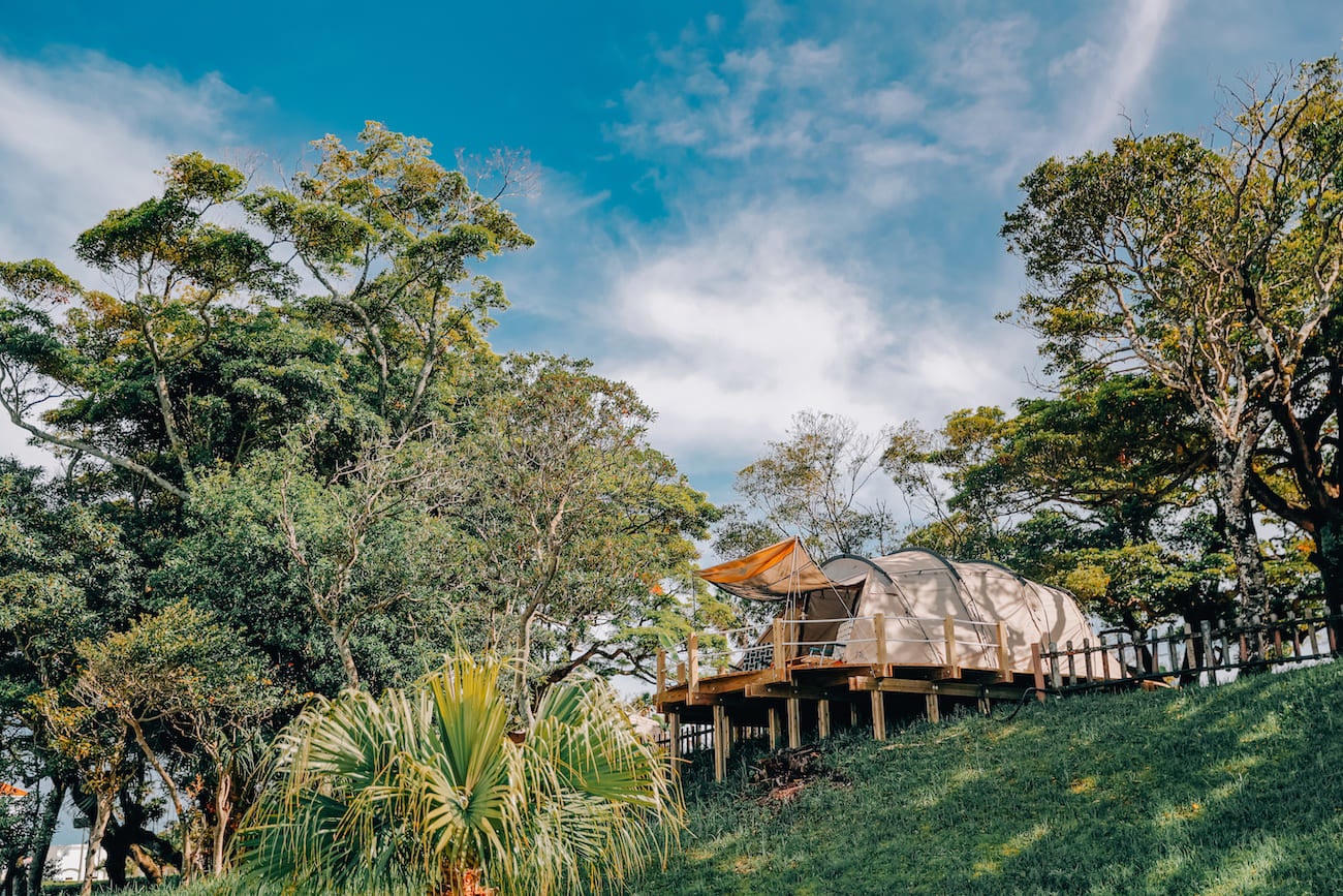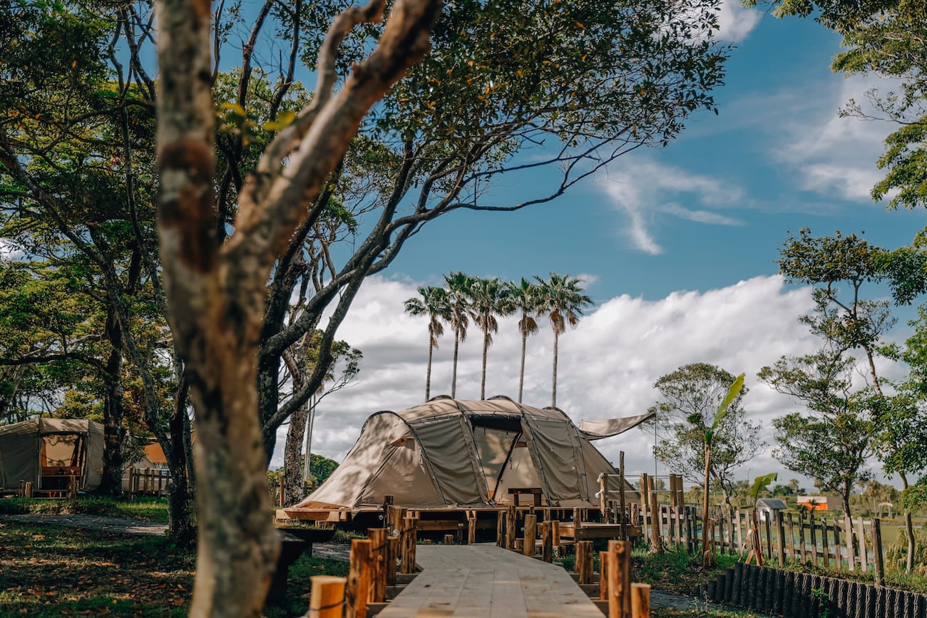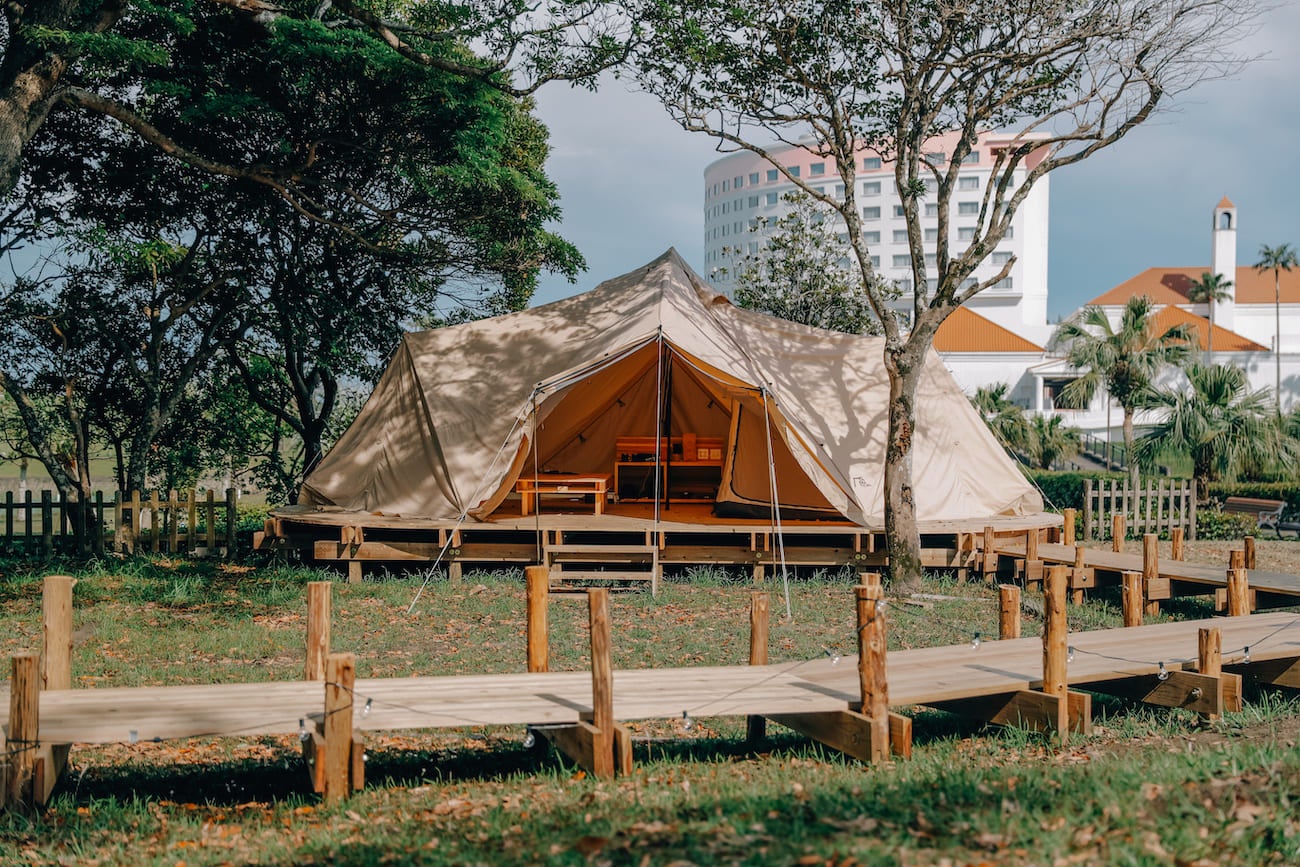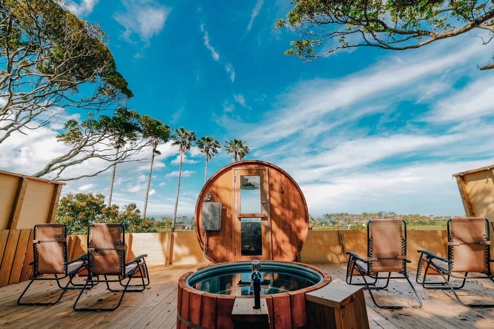 タブの森内、青島の海とこどものくにの大自然を見渡すキャンプサイトでは、テントの貸出を実施。宮崎県内では珍しい、オランダ製の「サファリテント」で宿泊ができたり、手ぶらでキャンプをお楽しみいただけます。