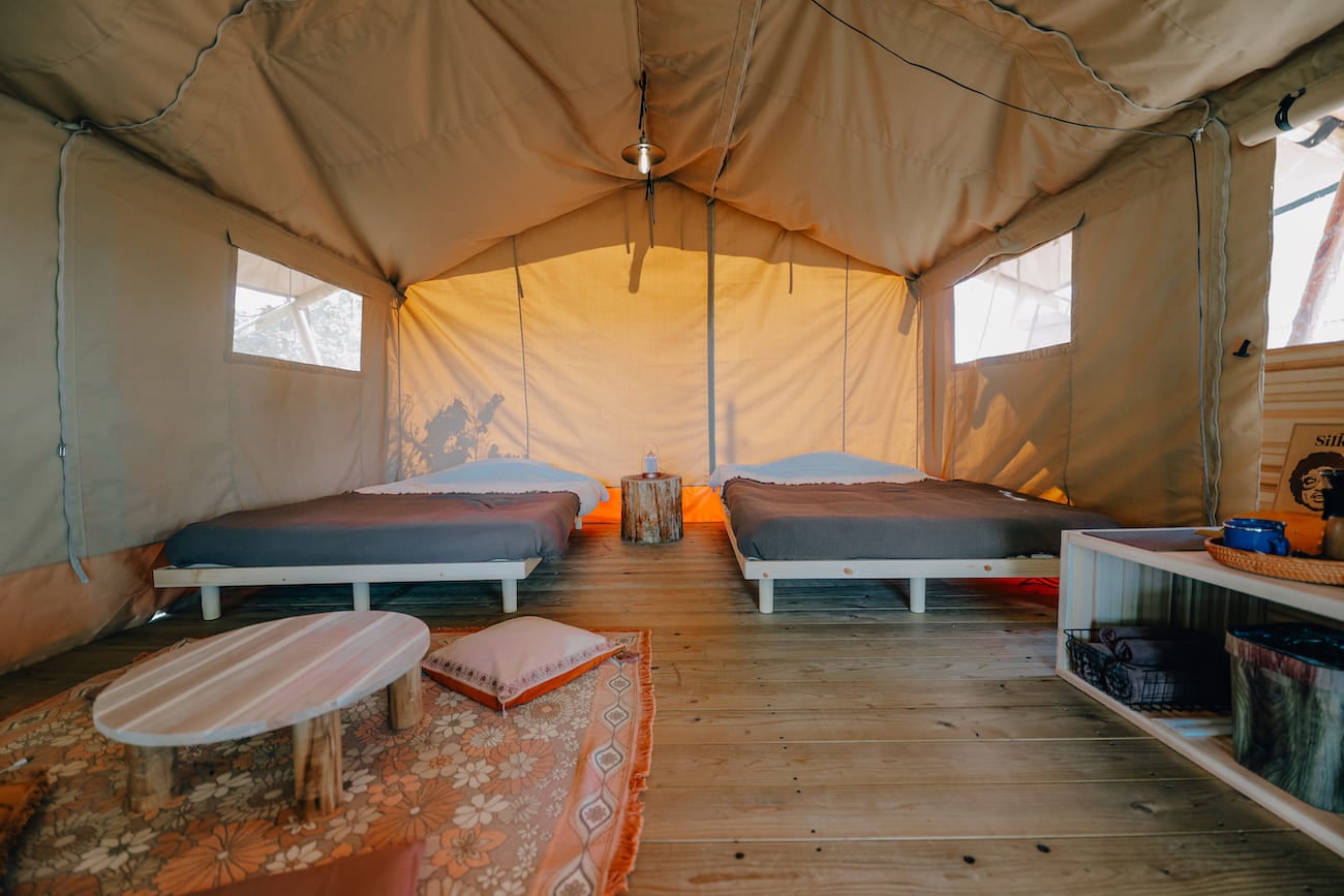 ①エアコンや冷蔵庫、ベッドも完備したオールシーズン快適なサファリテントで宿泊