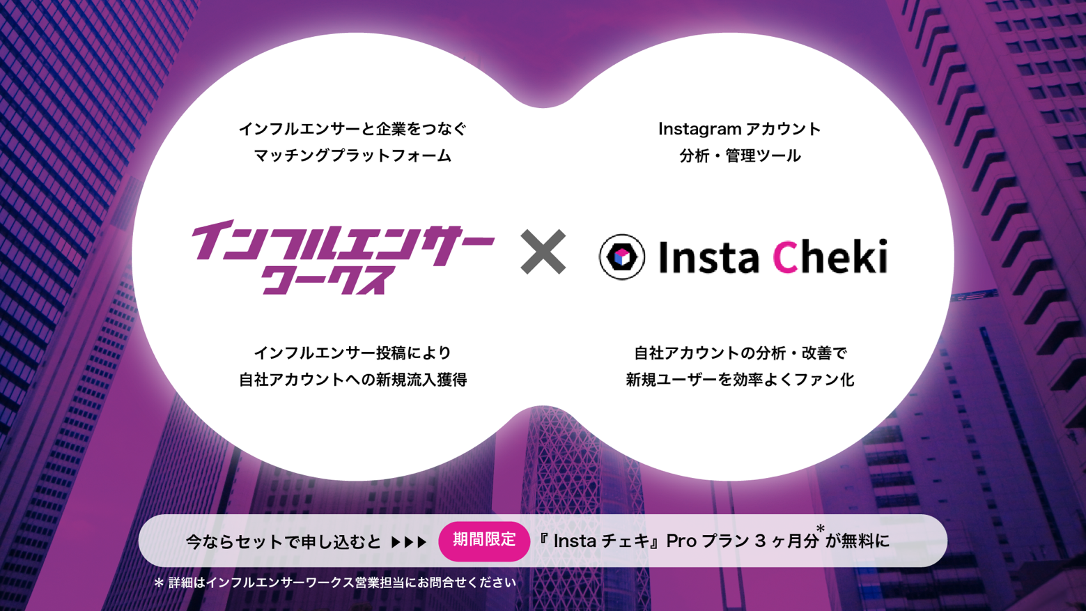 本セットプランでは、月額5万円から定額でインフルエンサーに対してお仕事を依頼し放題の「インフルエンサーワークス」とInstagramアカウントの分析・管理を行うことのできるInstagram分析ツール「Insta Cheki」を同時にご契約いただくことで、Insta ChekiProプランを3ヶ月間実質0円※でご提供いたします。