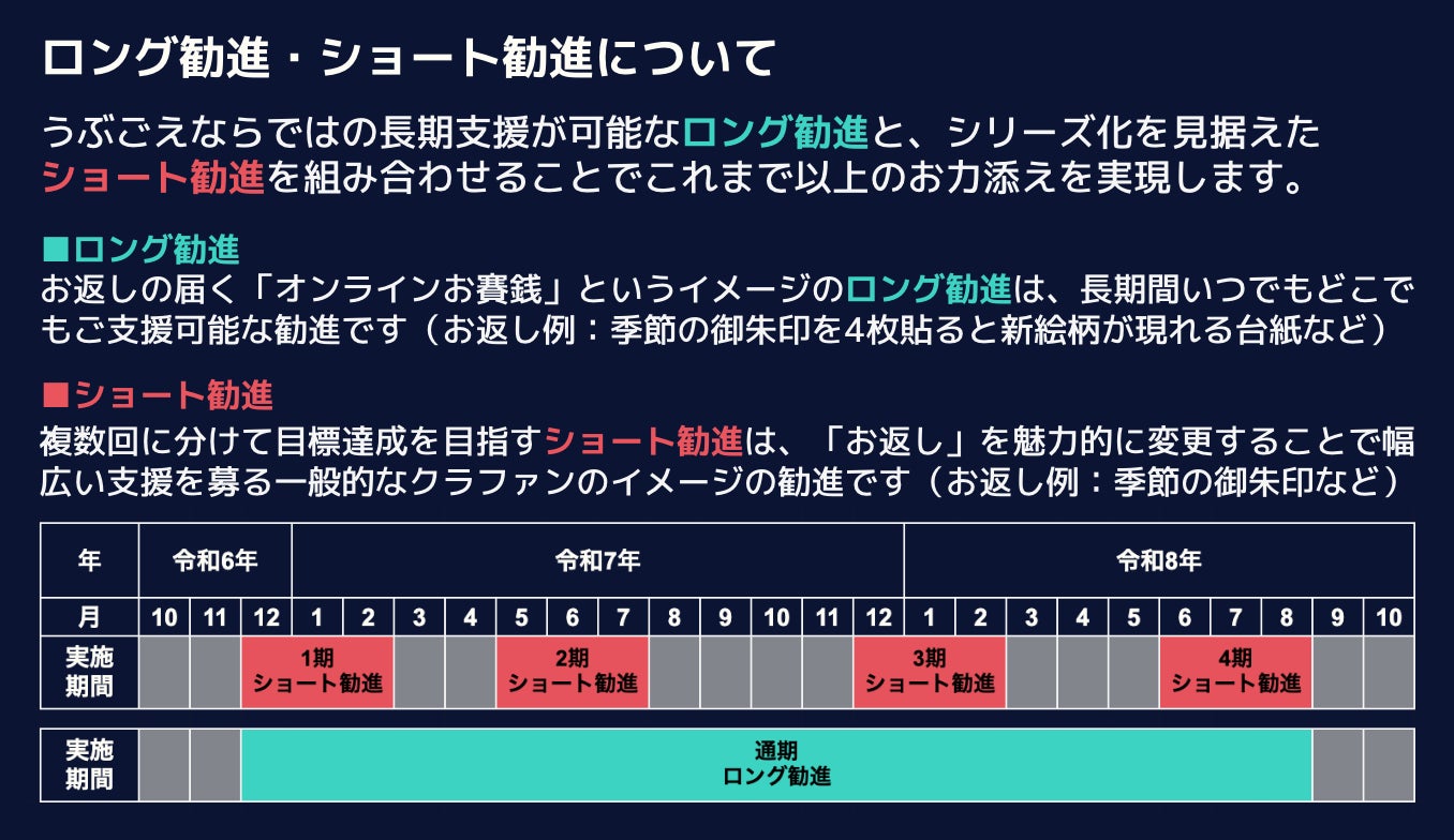 うぶごえ株式会社(本社:東京都渋谷区、代表:岡田一男)は株式会社神社仏閣オンライン(本社:京都府京都市、代表:河村英昌)及び一般社団法人SOCIAL TEMPLE(本社:山梨県中央市、代表:近藤玄純)と提携。2024年12月23日(月)12:00より寺社に特化したクラウドファンディング「現代の寺社勧進プロジェクト」https://ubgoe.com/brands/jisha-kanjinを開始いたします。初号案件は同時に募集開始となる、身延山奥之院思親閣の「ショート勧進」「ロング勧進」二つのプロジェクトとなります。