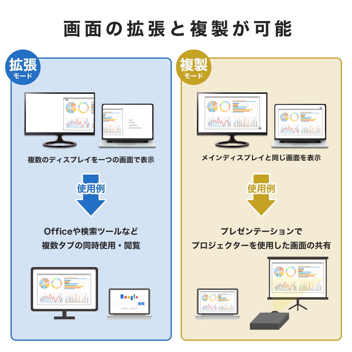 ドライバーなどのインストールは必要ありません。接続するだけで簡単に画面の拡張・複製が可能です。