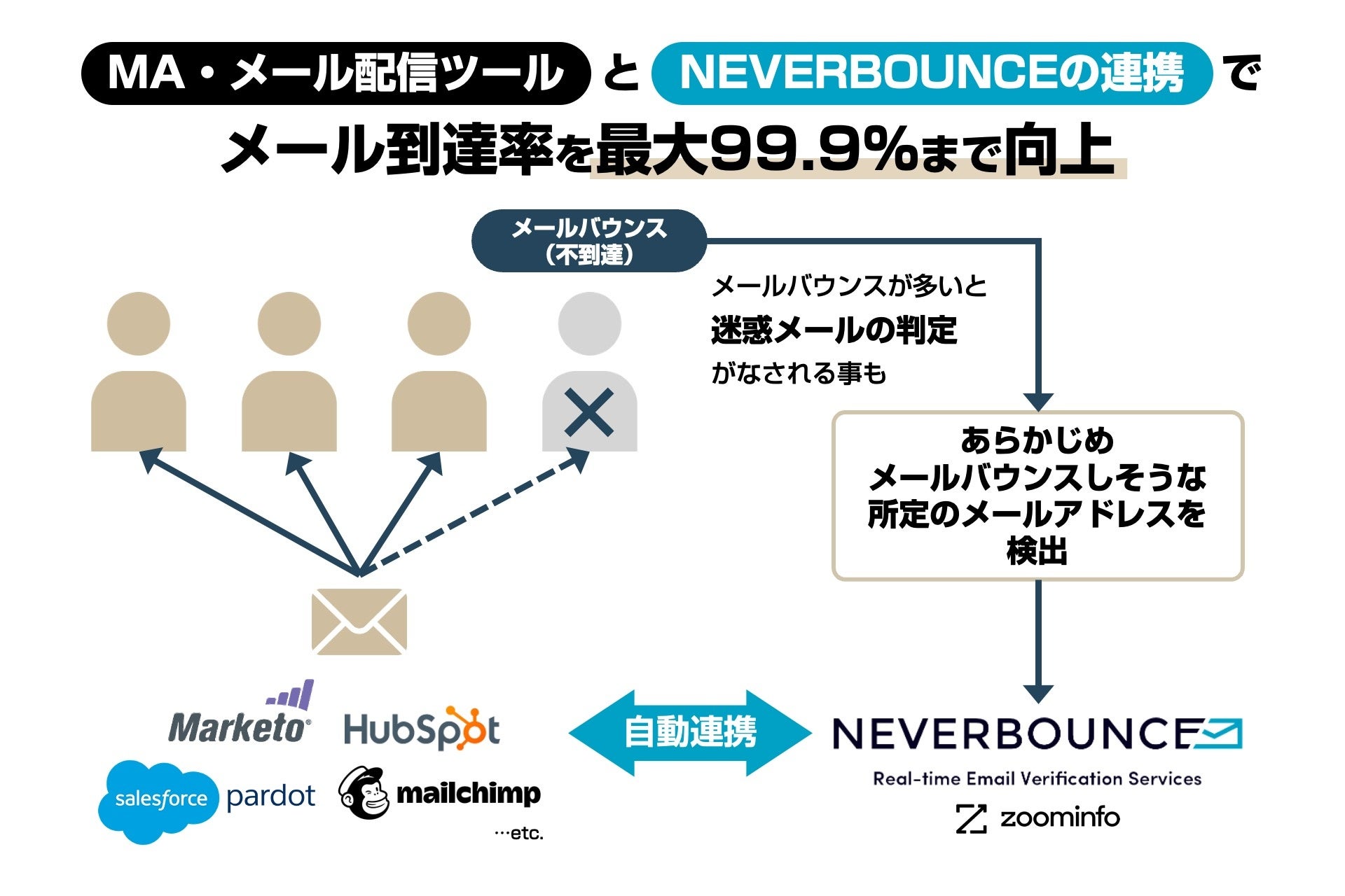 ネバーバウンスは、メール配信することなくメールアドレスのチェックを行うツールです。配信したメールの到達率を最高99.9%まで上げることが可能になります。また、Pardot、Marketo、HubSpotなどとの連携が可能です。