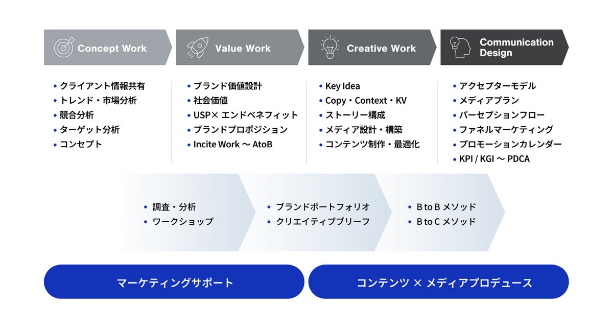 本サービスでは、お客さまの課題解決に必要なコミュニケーション施策を立案し、分析・企画からコンテンツ制作・媒体運用までトータルワークでご提供します。