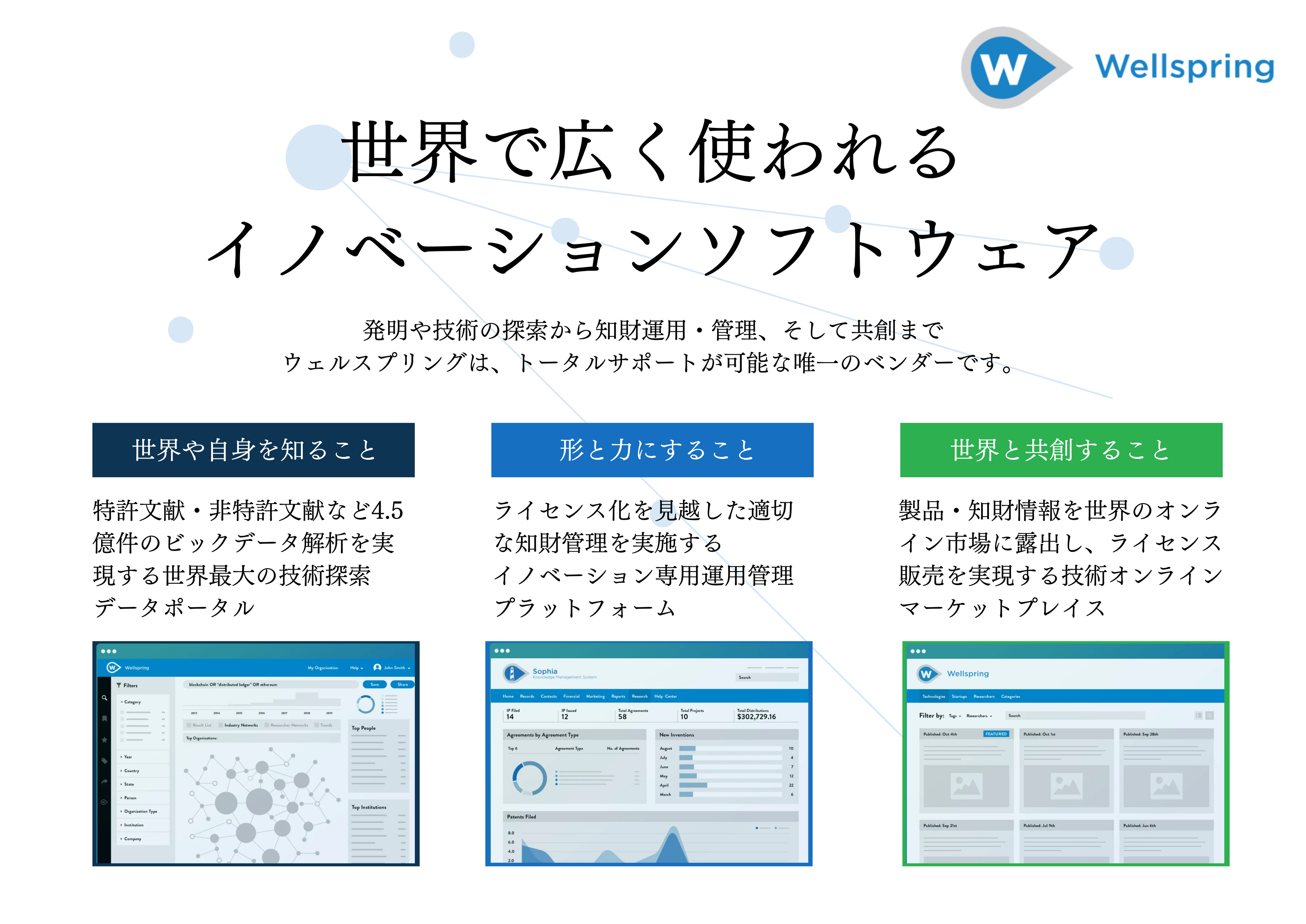 ウェルスプリングは技術移転、技術探索、イノベーション運用管理システムにおける世界を代表するソフトウェア企業です。世界中の企業、大学、研究機関の皆様が技術の検索、評価、ライセンシング、パートナー開拓、投資判断など幅広い分野やシナリオでご活用されています。