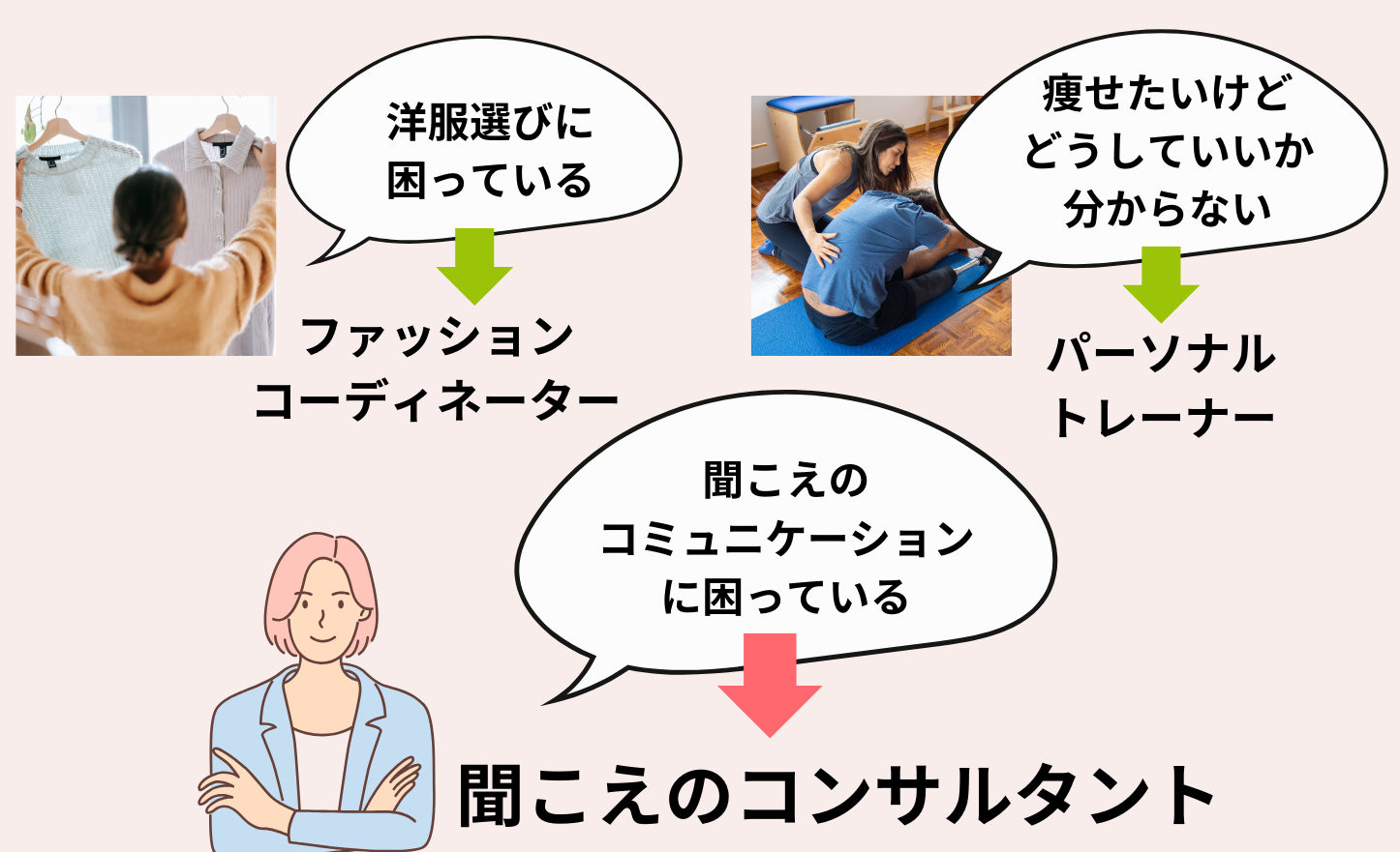洋服選びに困っているときは、ファッションコーディネーターに相談し、痩せたいときにはパーソナルトレーナーに相談する。同じように、聞こえの問題に困っているときは、うぐいす補聴器が聞こえのコンサルタントとして、問題の解決に向けてサポートします。