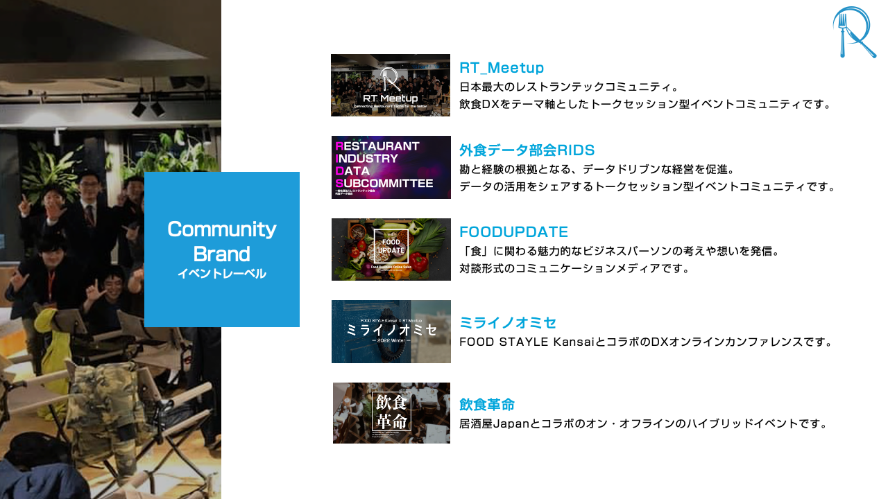 テクノロジー企業を中心とした賛助会員の皆様をはじめ、数多くの業界企業や業界団体の皆様と共に、数多くのイベントやコミュニティ運営を通じて、飲食業界へDXの普及活動を行なっております。