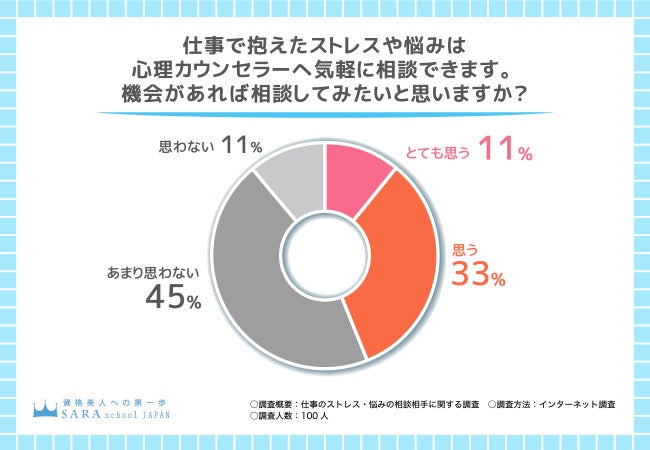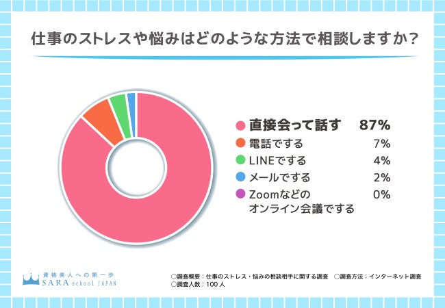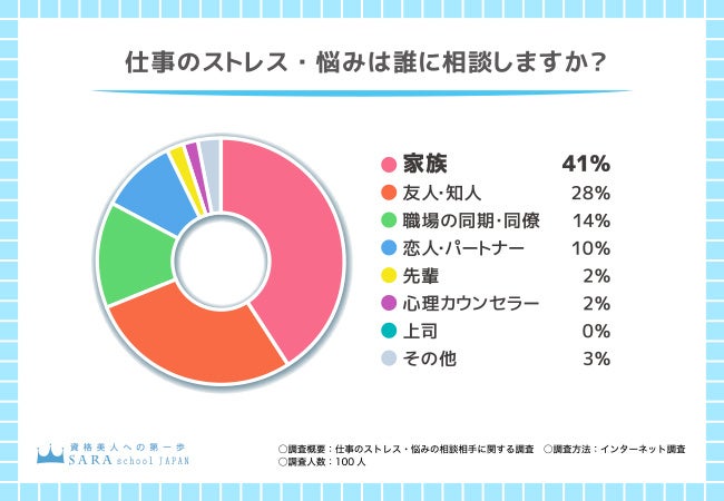 そこで今回、通信教育講座『SARAスクールジャパン』(https://www.saraschool.net/)を運営する株式会社新生技術開発研究所は、全国の男女100名を対象に「仕事のストレス・悩みの相談相手」に関する調査を実施しました。