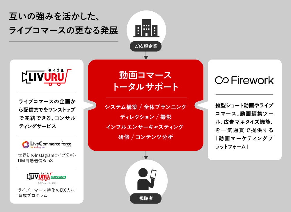 今回の協業は、ライブル導入企業への配信プラットフォームとしてのFireworkの活用強化、Firework導入企業へのライブコマース領域におけるプランニングやデータ分析によるコンサルティングの強化とライブコマースフォースを通じた売り上げ増加を目的としています。