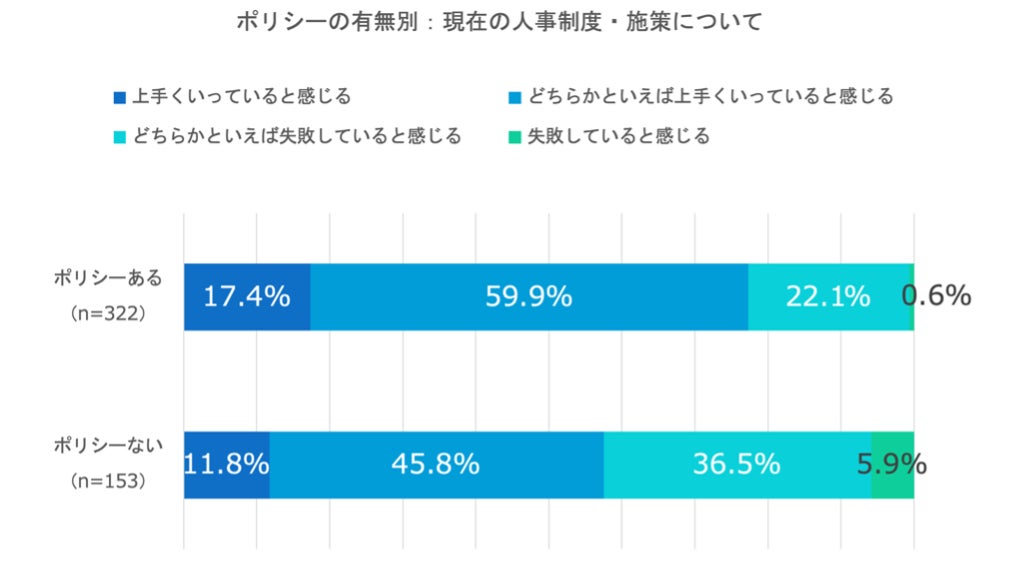 また、自社の人事制度や人事施策に対する成否について、人事ポリシーのある企業では約7割の企業が上手くいっていると回答し、人事ポリシーがない企業と比べてポジティブな結果となっている。