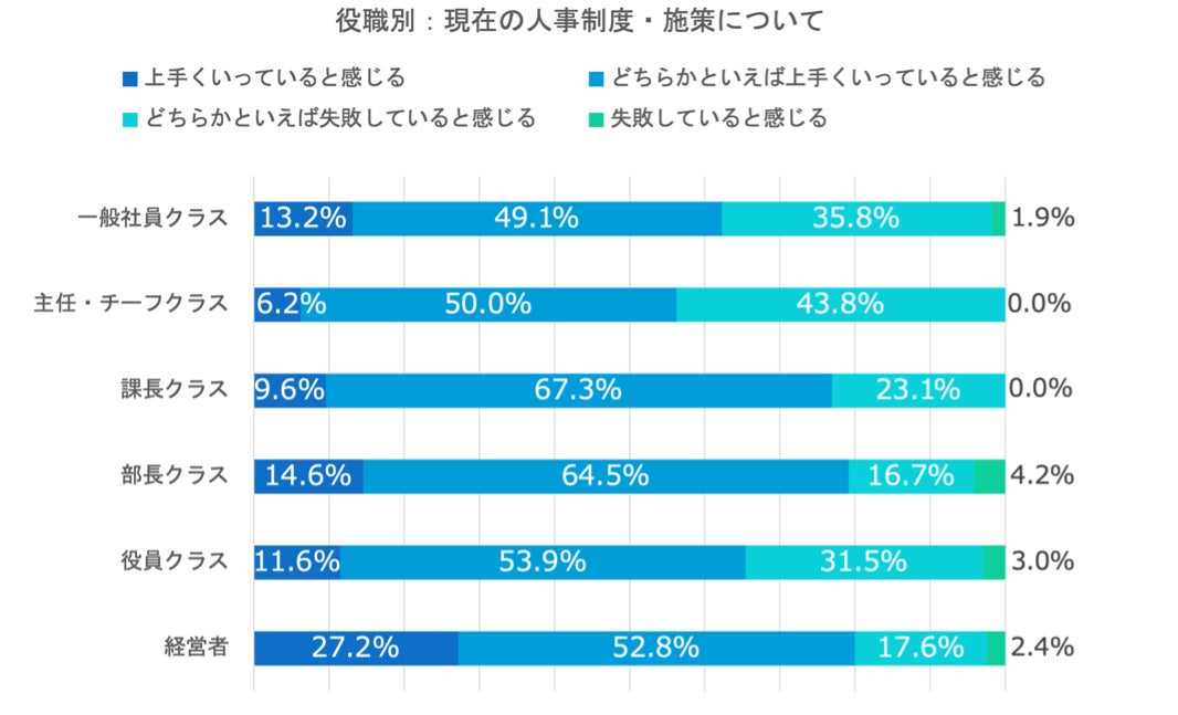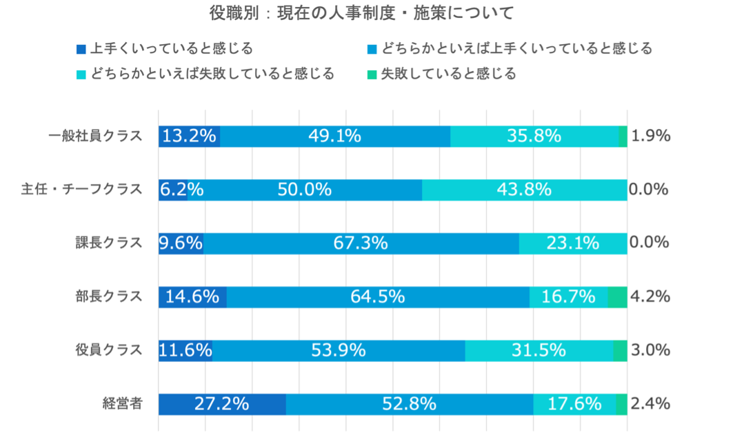 現在運用している人事制度や人事施策の成否を聞いたところ、「上手くいっている(15.6%)」「どちらかというと上手くいっている(55.4%)」で、約7割の企業がポジティブに回答した。しかし、人事ポリシーが「ない」と答えた企業は「ある」と答えた企業に比べ、上手くいっている割合が約20ポイントも少ないという結果となった。また、役職者別では、一般社員、主任・チーフクラスでは約4割が「失敗している」「どちらかというと失敗している」と回答した一方で、課長や部長、経営者クラスでは2割前後にとどまった。→Q.2参照