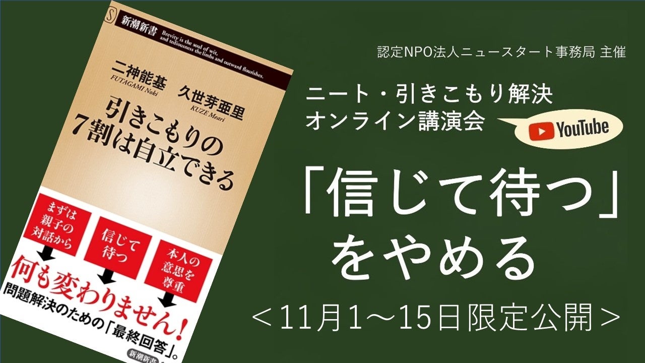 引きこもり・ニートの自立支援団体である認定NPO法人ニュースタート事務局の、公式YouTubeアカウントにて、2020年秋に実施したオンライン講演会の動画を、11月1~15日の期間限定で公開します!