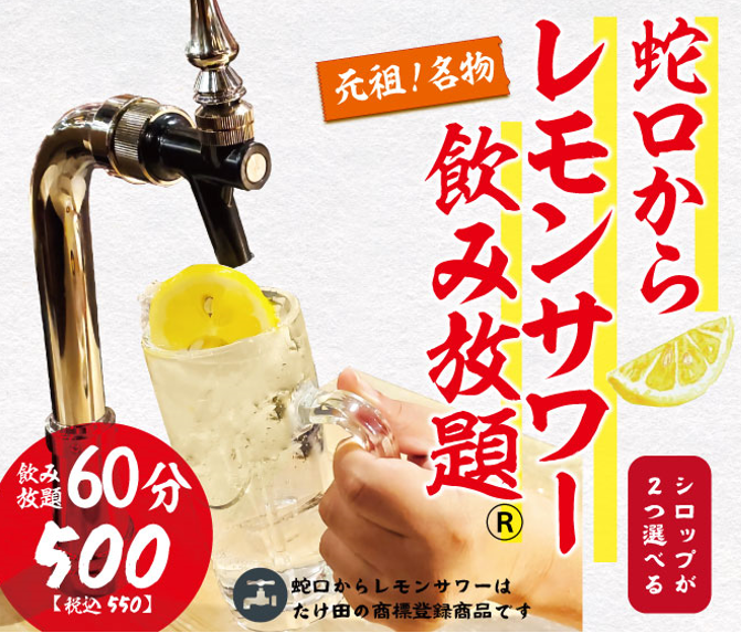 オーダー率99.9%の各テーブルに設置されたレモンサワーは、好きなだけ注げるレモンサワー好きには堪らないシステムです。60分500円(税込550円)という価格だけでなく、6種のシロップで味変も楽しめるエンタメ感満載の「蛇口レモンサワー」は、お客様からの高い支持を得ています。