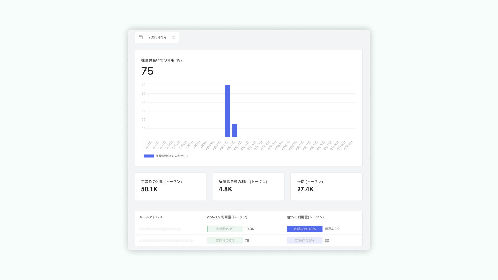 企業で利用している社員のアカウントごとに、利用具合を可視化できる機能です。月ごとに集計されている画面で、その中では「活用しているAIのモデル」「定額の範囲に対して何%まで利用しているか」など、より詳細の活用具合がわかるような機能が実装されました。