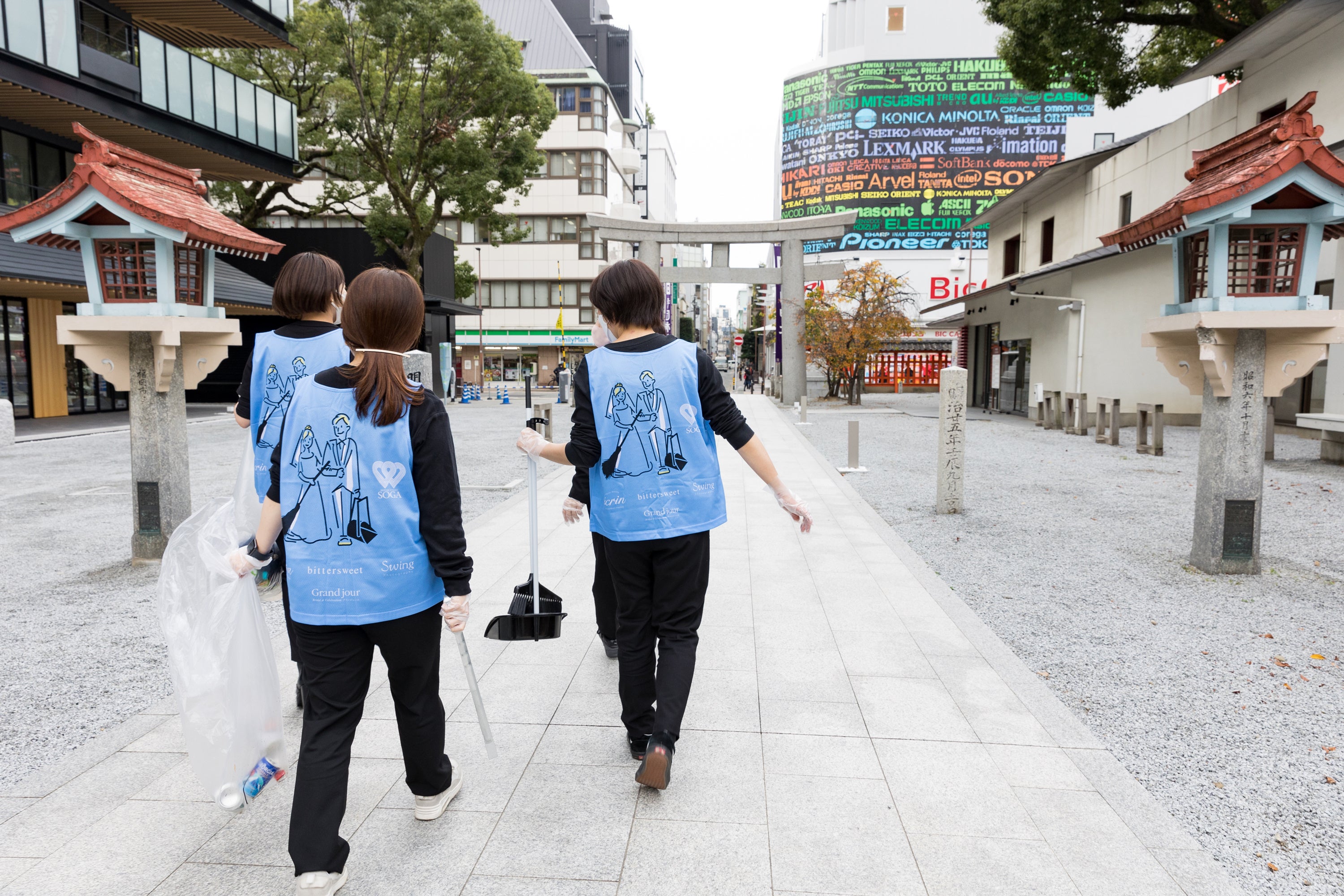 天気は曇天、朝9時より店舗から程近い今泉公園から活動をスタート。天神高速バスターミナル前の警固公園、国体道路などの約1キロメートルにわたり、近隣の保育園の方や通勤途中の方との朝の挨拶を交わしながら、お客さまがご来店するルートとなりそうな道を中心に清掃いたしました。