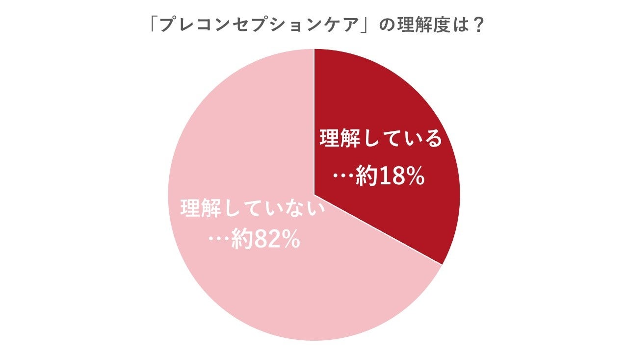 クレアージュが実施したアンケート調査では、「プレコンセプションケアについてどのくらい理解できていますか?」という質問に対し、「よく理解している」「なんとなく理解している」と回答した女性の割合はわずか18%となりました。ま た年代別では、40代の理解度が若干下がるものの、年代を問わず全体的にプレコンケアの知識がないという結果が分かっています。プレコンセプションケアとは、妊娠・出産のために身体の健康を考え準備することです。将来の妊娠を考えながら自身の健康状態や生活習慣を見直し、改善することで、妊娠から出産後までを健やかに過ごせるようにすることを目的に身体をケアします。