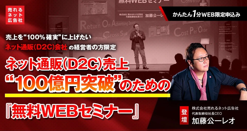 「ネット通販(D2C)」×「広告」に特化したクラウドサービスおよびコンサルティングサービスを提供する売れるネット広告社(代表取締役社長 CEO:加藤公一レオ、本社:福岡県福岡市)は、ネット通販(D2C)会社の経営者限定の無料WEBセミナーを毎週開催致します。