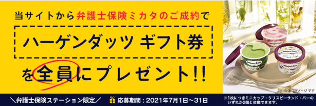 《株式会社エレメント》(本社:神奈川県川崎市、代表取締役:近藤勉)は、弁護士保険ミカタの販売促進のため、ご成約者の中から抽選で30名様に「ハーゲンダッツ ギフト券」をプレゼントするご成約キャンペーンを《2021年7月1日(木)》より開始いたしました。