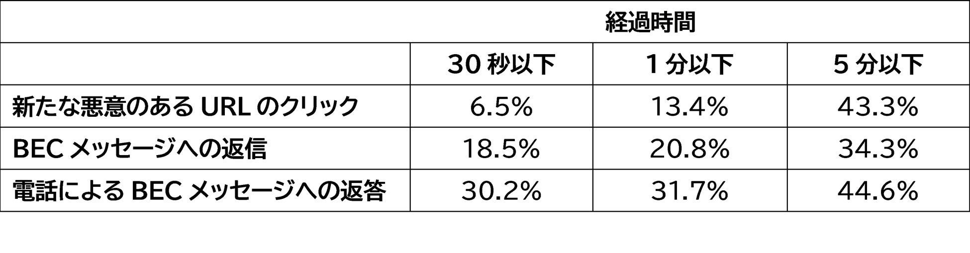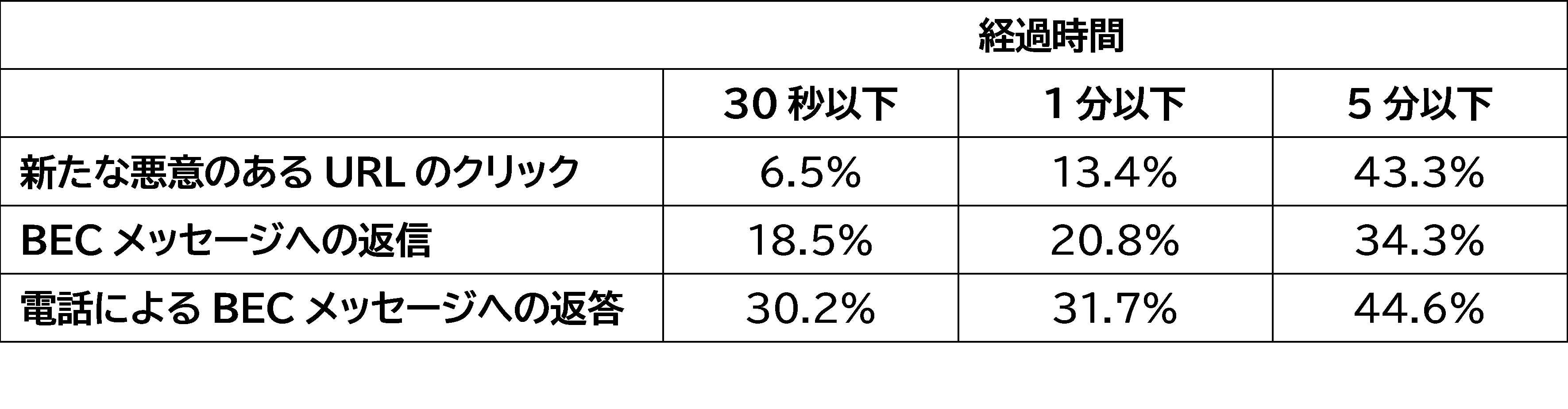 世界中の23万を超える組織におけるプルーフポイントのテレメトリーによると、メールを受信トレイに配信する前の保護が非常に重要なのは、配信後の検知では手遅れになることが多いためです。悪意のあるURLのクリックは7件に1件ほどがメール受信後1分以内に発生しており、BECへの返信の3分の1以上は5分以内に発生しています。ユーザーが攻撃の餌食になる可能性があるこれらの狭い時間枠は、悪意のある攻撃がユーザーの受信トレイに到達する前にブロックすることの重要性を強調しています。