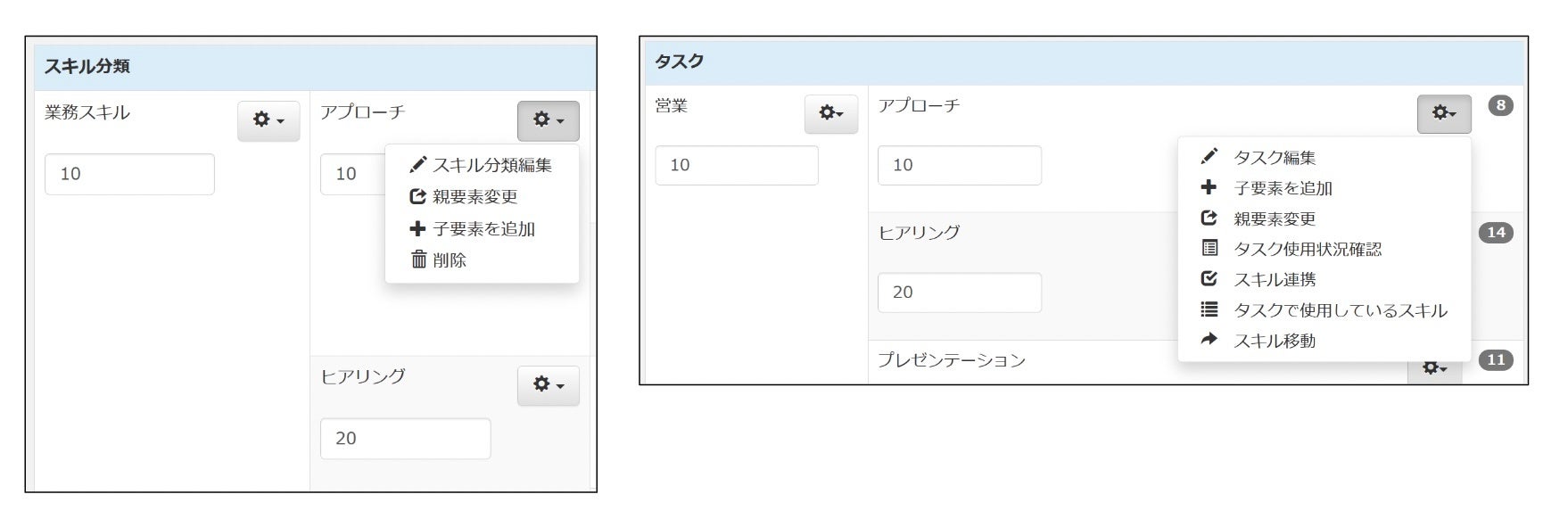 任意のスキル・タスク分類ごとに「親分類との関連付け」、「配下分類の追加」、「当該分類の削除」が可能なUIにより、スキル構造の階層が直感的に可視化されて、各スキル分類の属性変更を直感的な操作で行うことができるUIの提供を実現