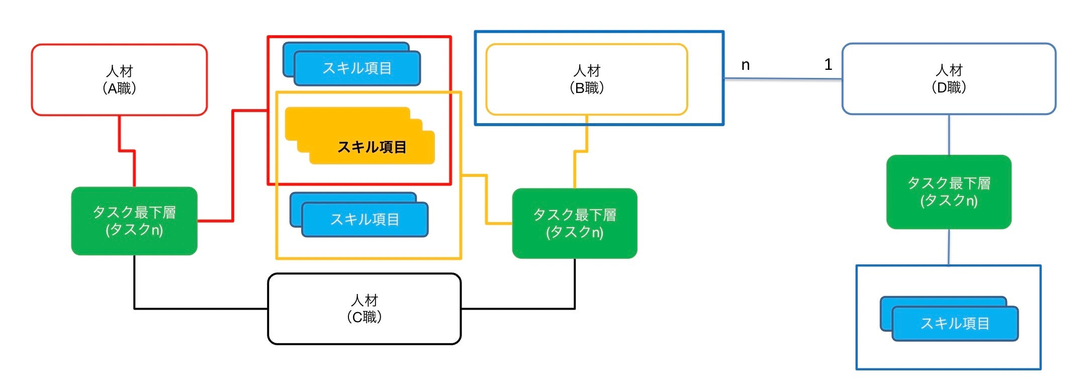 1つのタスクを複数人材定義に関連付け、また1つの人材定義を他の人材定義に関連付け可能なため、各種人材の定義が無制限に可能で人材定義へのスキル・タスク構造の関連付け情報管理を実現