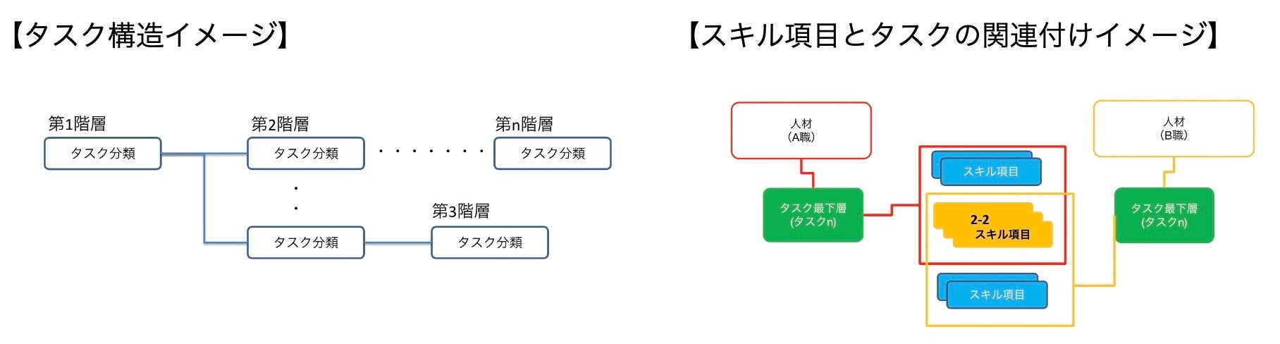 タスク構造を「無制限の多階層構造」で保持、1つのスキル評価値を複数タスクに関連付けできるため、スキル評価項目を直接人材の評価項目として関連付けせずに中間の紐づけ用タスク構造を介して関連付けを保持が実現