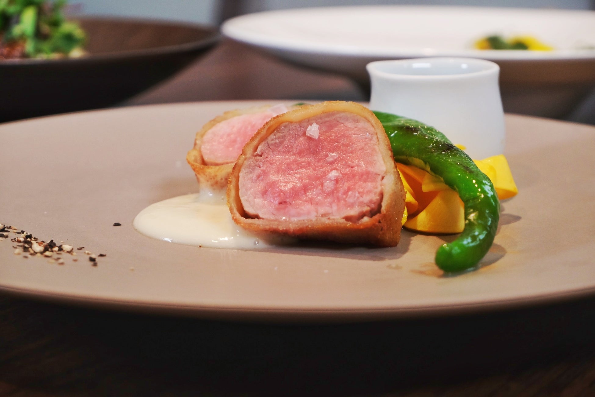 ・肉料理「発芽米パン粉でパネした緑茶豚フィレ肉 二種の発酵ソース」(日本)