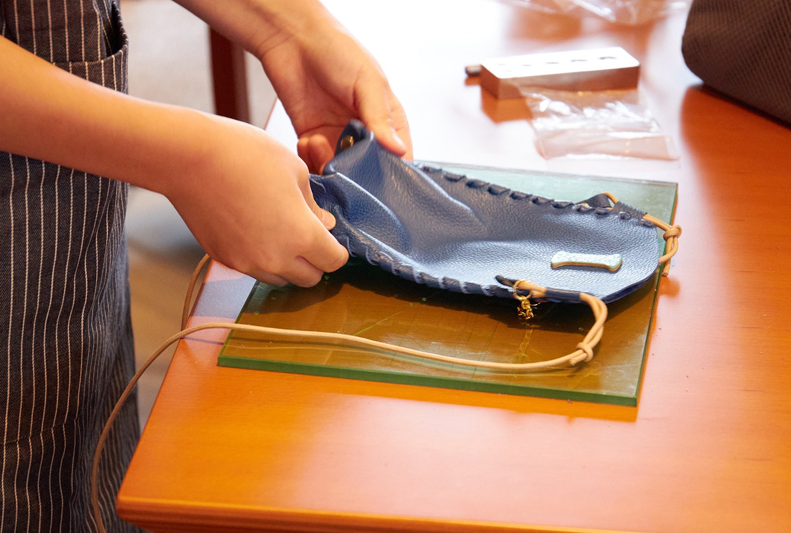 ワークショップでは、製造時に出る革の端材を使ってポシェットを制作。「普通なら捨てられてしまう素材が新しい価値を持つ」驚きと、自然素材の美しさを感じながら、環境を守る大切さを学べます。