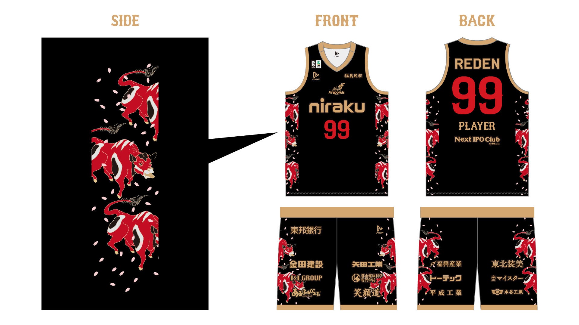 闘う赤べこ、舞う桜、そして炎の絆。躍動するFirebondsの勇猛果敢な姿をそこに重ねました。