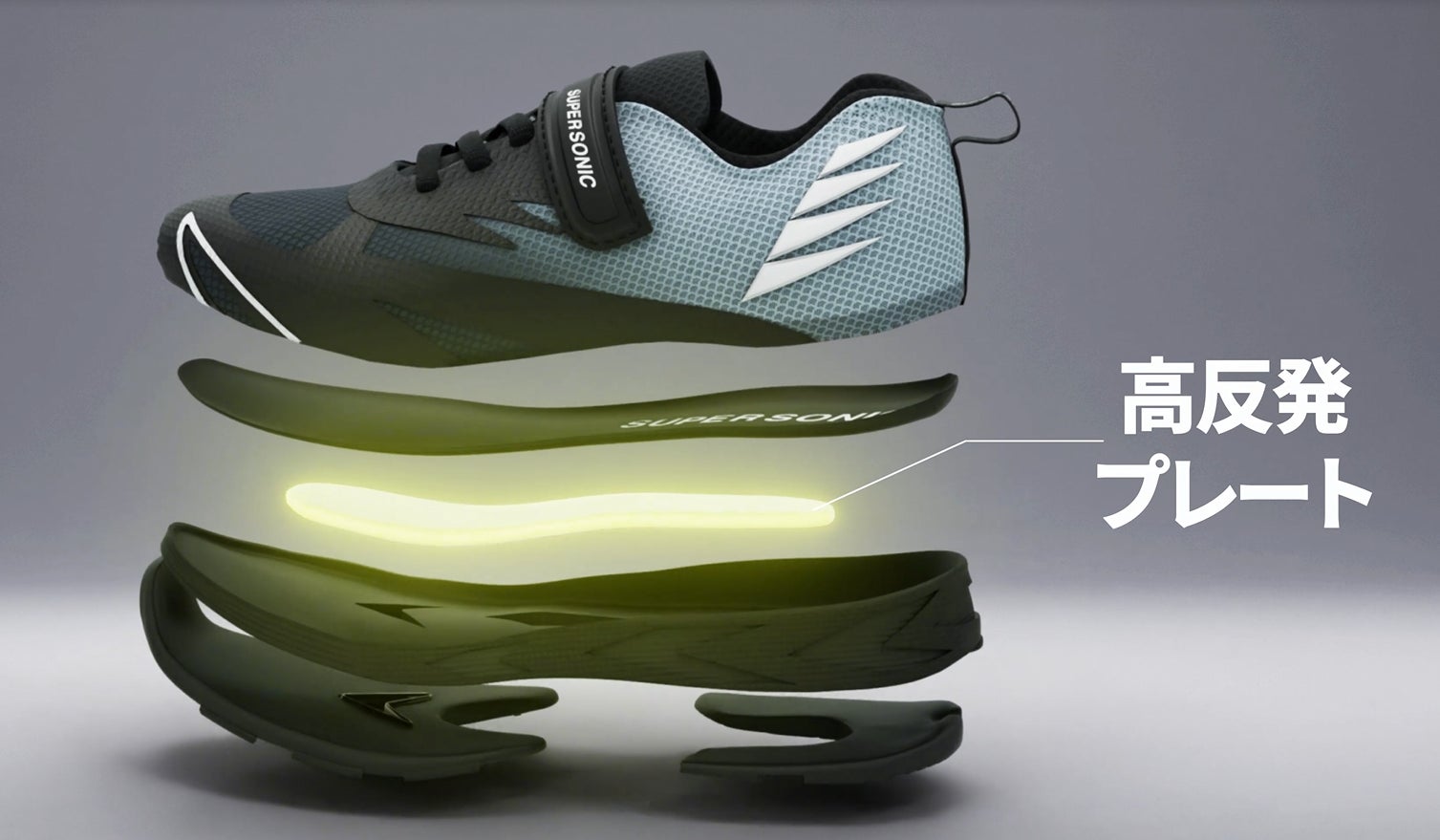 ⼦どもの⾛り⽅の特徴に合わせた設計の高反発プレート搭載で、子供靴としては異例の最先端構造を実現しています。