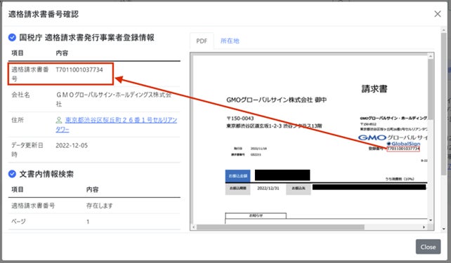 電子化された適格請求書に記載された「登録番号」と、eシールに記載した「登録番号」を突合。突合した「登録番号」を国税庁のサイトにおいて自動で検索したところ、適格請求書の発行元と登録番号の紐づけが可能であることが検証されました。