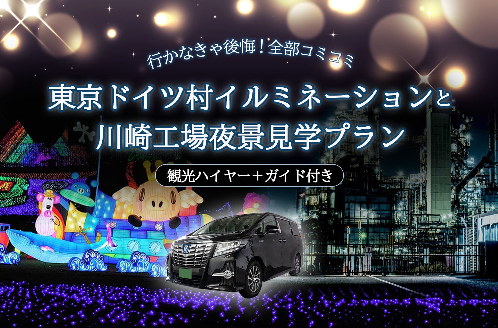 観光ハイヤーでカラフルでポップな東京ドイツ村のイルミネーションと観る者を圧倒する川崎工場夜景の2つを巡り、対比できる究極の夜景見学プランが登場。