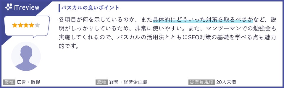 ITreviewにて、パスカルを実際に利用いただいているお客様よりたくさんのお声をいただいております。お客様からは「初心者でも使いやすい」「導入後のサポートが手厚い」などのコメントをいただきました。