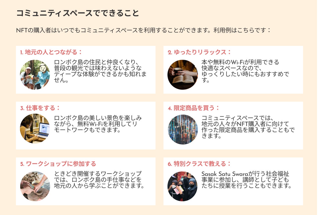 まちづくりには、NFTの購入者も参画することができ、投票を通して自らのアイディアをまちづくりに反映させることができます。また、NFTの購入者はLombok Kidz NFTの将来的な価値向上によって経済的利益を得られる可能性があるほか、ロンボク島を訪れた際に地元の人から観光ガイドを受けたり、建設予定のコミュニティスペースで交流や仕事を楽しんだり、地元の伝統的な行事やお祭りに現地の人々と一緒に参加したりすることができるといった、特典を得られる予定です。