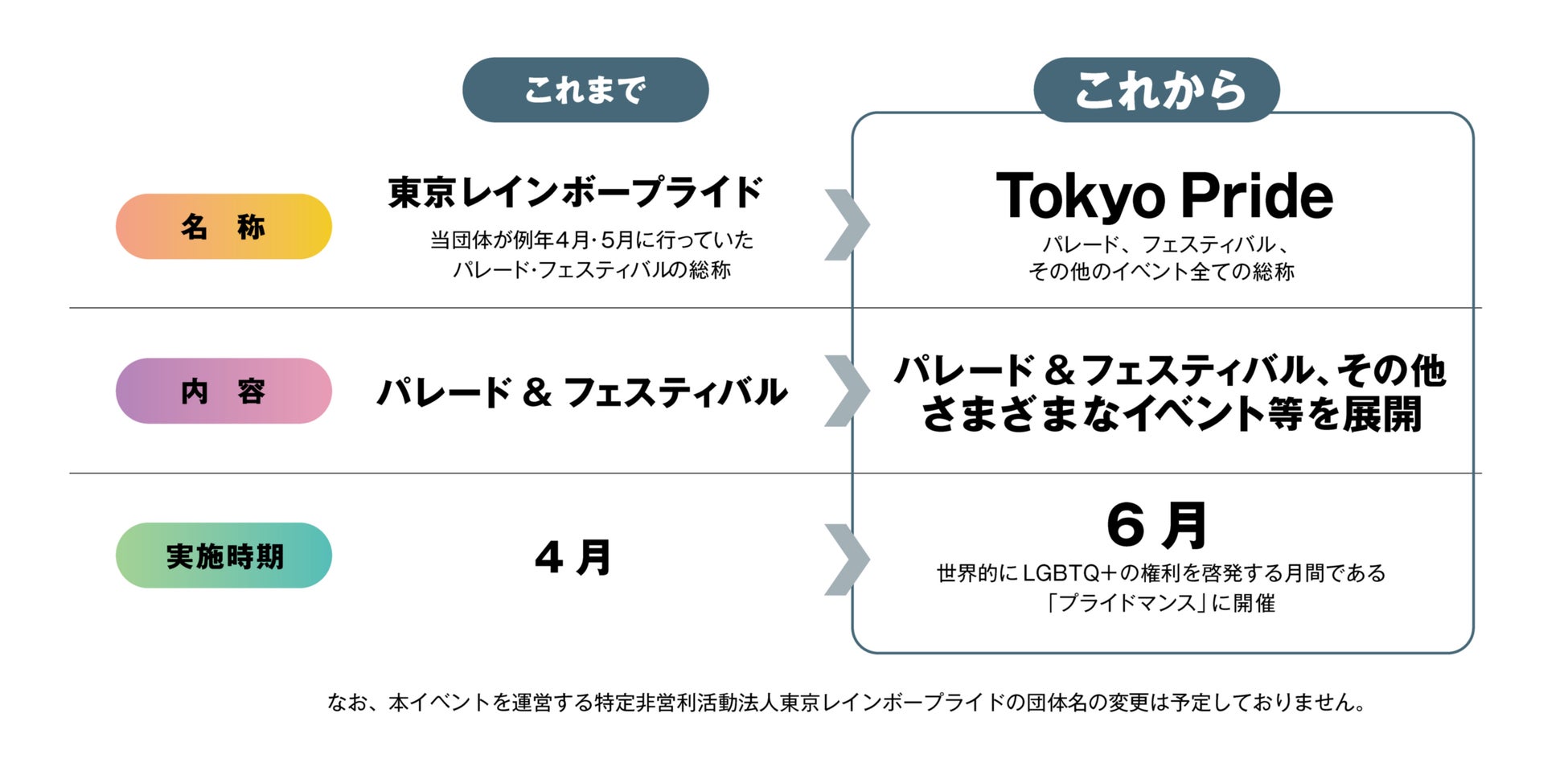 なお、本イベントを運営する特定非営利活動法人東京レインボープライドの団体名の変更は予定しておりません。