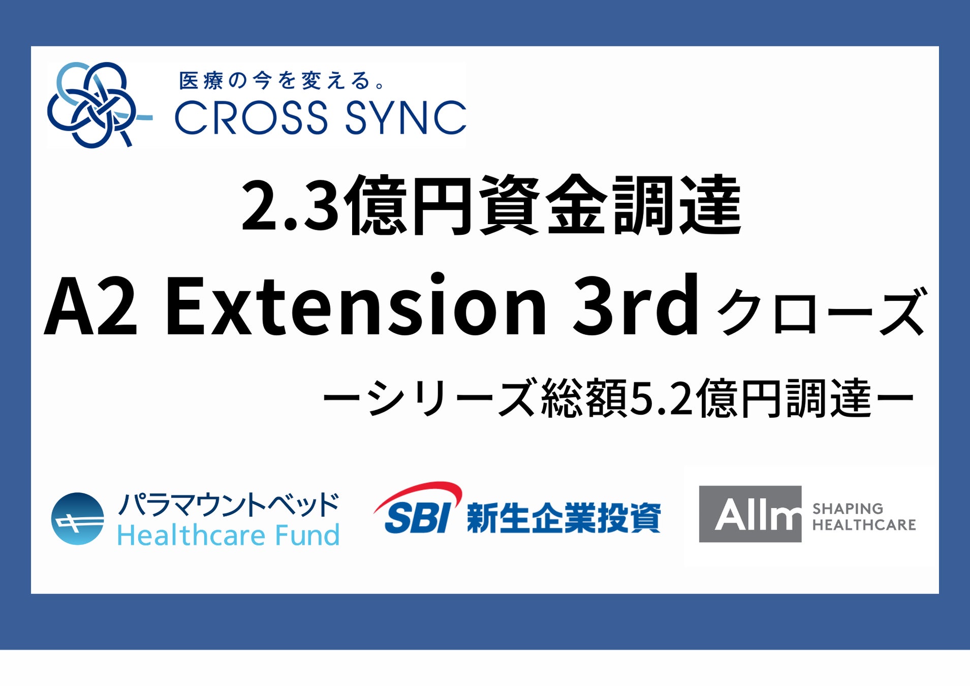 株式会社CROSS SYNC(代表取締役:髙木俊介・中西彰、以下「当社」)は、パラマウントベッド株式会社(代表取締役 社長執行役員:木村友彦)、SBI新生企業投資株式会社(代表取締役社長:植坂謙治)、株式会社アルム(代表取締役社長兼CEO:大谷駿明)を引受先とする第三者割当増資により2.3億円の資金調達を実施し、シリーズA2エクステンションのサードクローズを完了いたしました。