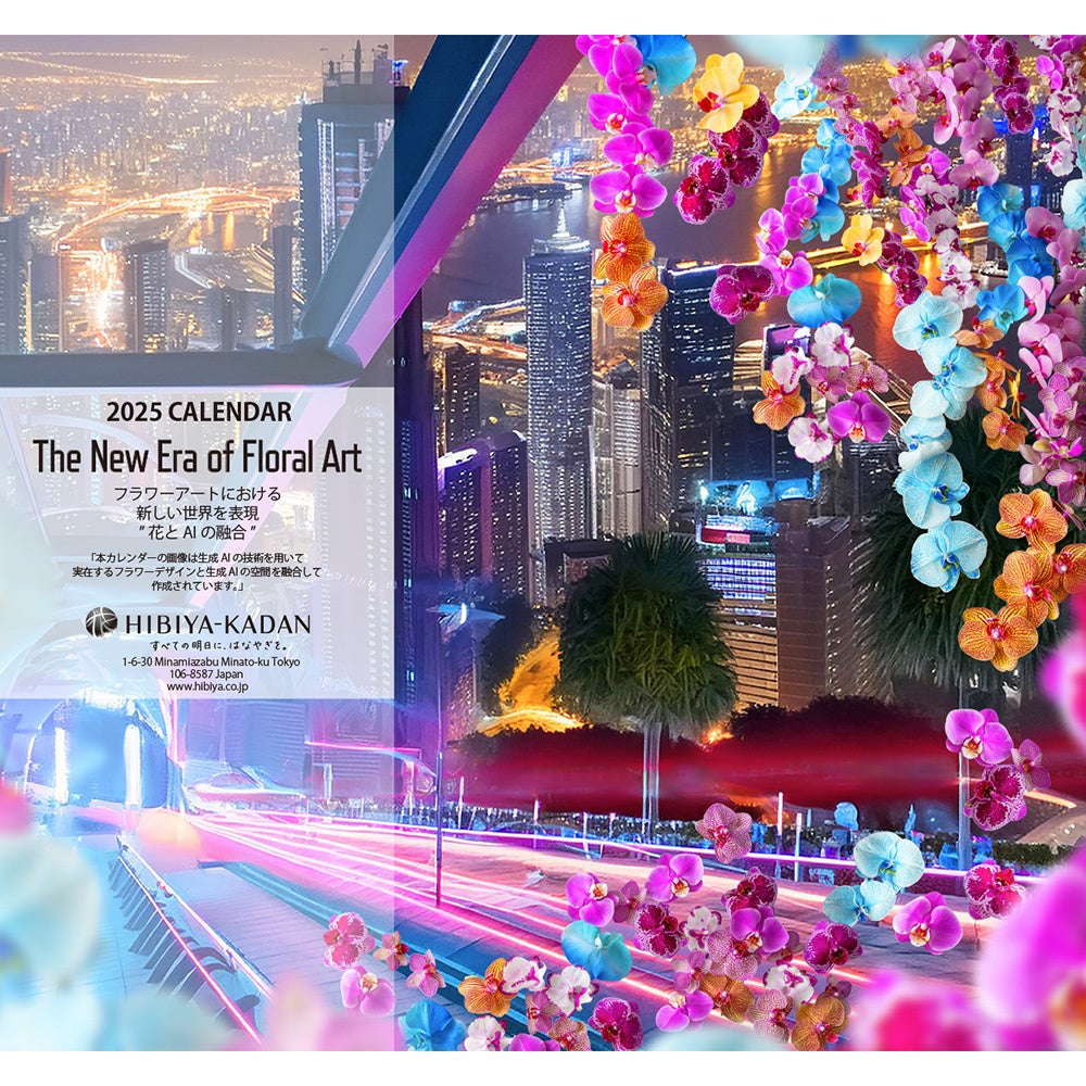 毎年好評いただいている日比谷花壇のオリジナルカレンダー。2025年版は、当社設立75年の歴史の中で初の試みとして生成AIの技術を活用しました。『The New Era of Floral Art』をテーマに、日比谷花壇グループが誇るフローリストたちがデザインした実在の生花によるリアルなフラワーアレンジメントと、AI技術によって生みだした世界の風景を想わせるバーチャルな空間画像を合成し、人間の感性とAIによるデジタルな創造が融合した新しい形のフラワーアートへと仕上げました。