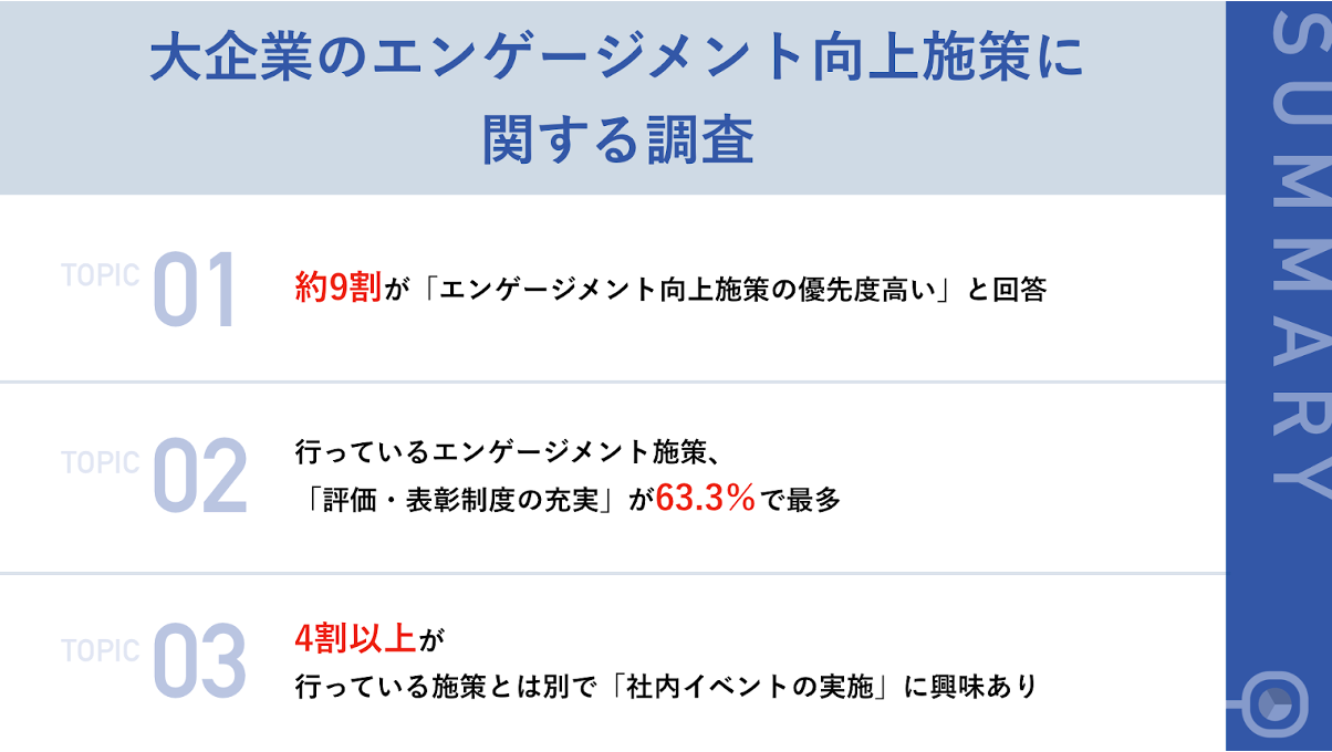 イベントプロデュース事業を行う株式会社グローバルプロデュース(本社:東京都渋谷区、代表取締役社長:光畑真樹、https://www.global-produce.jp/)は、エンゲージメント向上施策を行う大企業(従業員数1,000名以上)の人事担当者109名に、大企業のエンゲージメント向上施策に関する調査を実施いたしましたので、お知らせいたします。