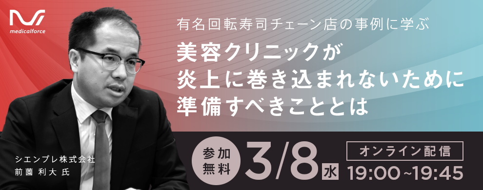 自由診療向けのオールインワンSaaS「medicalforce」を提供する株式会社メディカルフォース(所在地:東京都品川区、代表取締役社長:大嶋 翼)は、ネットのクチコミやSNSなどの炎上をはじめとしたデジタル被害対策の特別ウェビナーを美容クリニック向けに開催します。日時は2023年3月8日(水) 19:00~19:45、参加費は無料です。デジタル被害対策をご専門とするシエンプレの前薗利大さんを講師に迎え、有名回転寿司チェーン店の事例などを交えて解説いただきます。