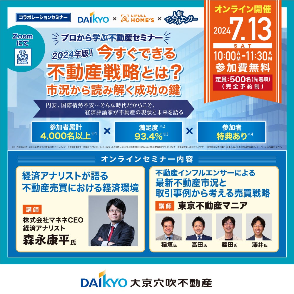 【7/13(土)10時】経済アナリスト森永康平氏登壇│2024年版!今すぐできる不動産戦略とは?~市況から読み解く成功の鍵~(無料オンラインセミナー)