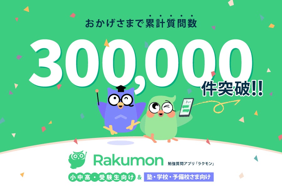 勉強質問アプリRakumon(以下、ラクモン)の累計質問数が30万件を突破しました。スマホ1台で“わからない”をすぐに解決できるアプリとして、小学生から大学受験生まで幅広くご利用いただいてます。