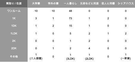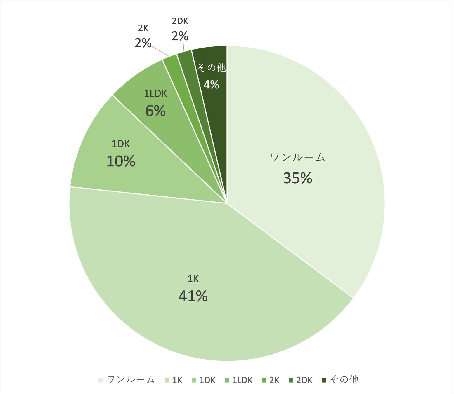 1人暮らしという条件に絞ると、「ワンルーム」+「1K」の割合は83%となる。大学生の間取りの選択肢としてはワンルームか1Kが主流という解釈で間違いなさそうだ。