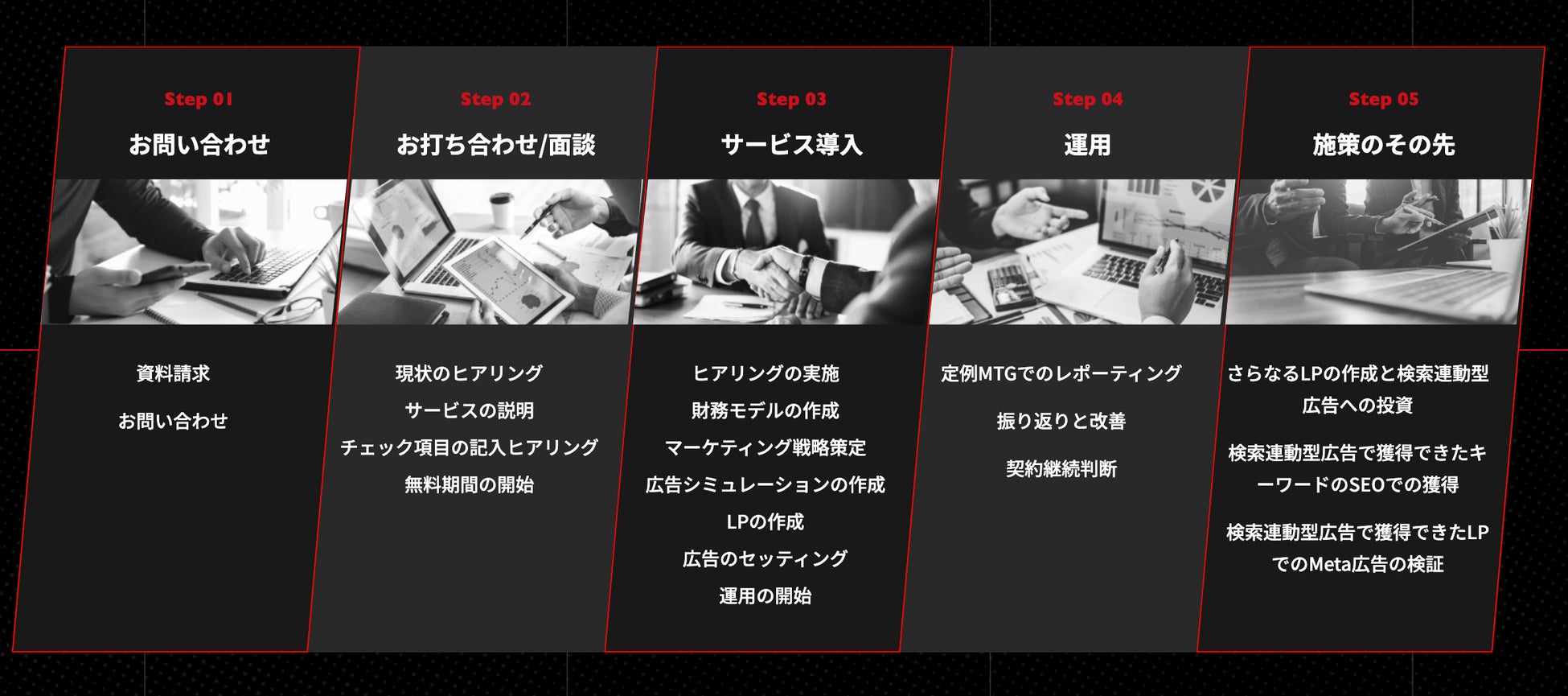 財務戦略、獲得戦略、LP作成、広告運用の実行支援は無償で提供し、広告出稿費のみご負担いただきます。開始から3ヶ月で黒字化に至らない場合は費用を一切請求せず終了します。