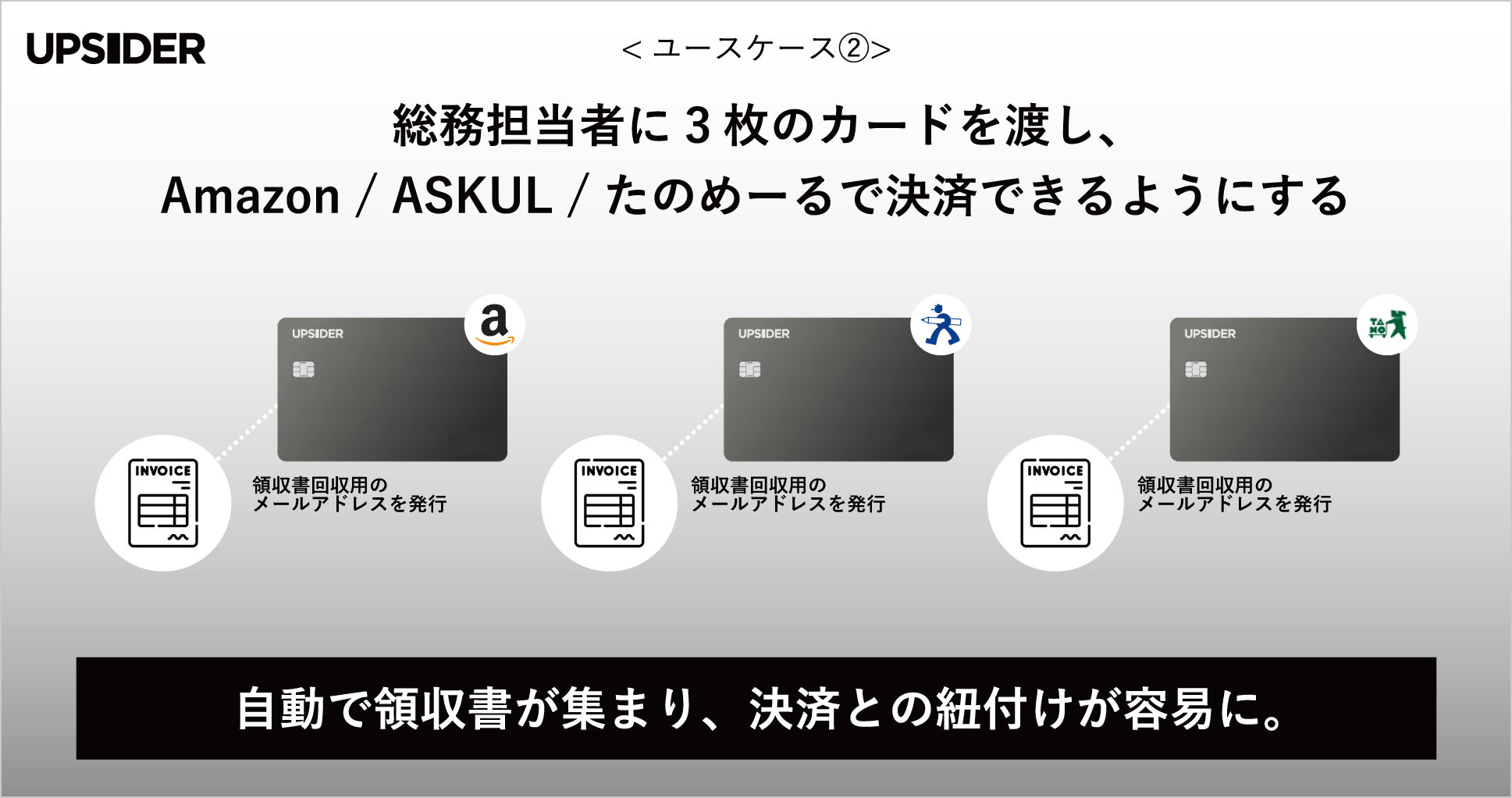 ・総務担当者に、3枚のカードを渡し、それぞれ Amazon / ASKUL / たのめーる で決済できるようにする。領収書回収のメールアドレスをそれぞれ発行し、それぞれのサービスの領収書送付先として指定することで、UPSIDER上に自動で領収書が集まり、回収の手間がなくなる。さらに決済への紐付けも出来るので、決済と領収書の付け合せもラクに。