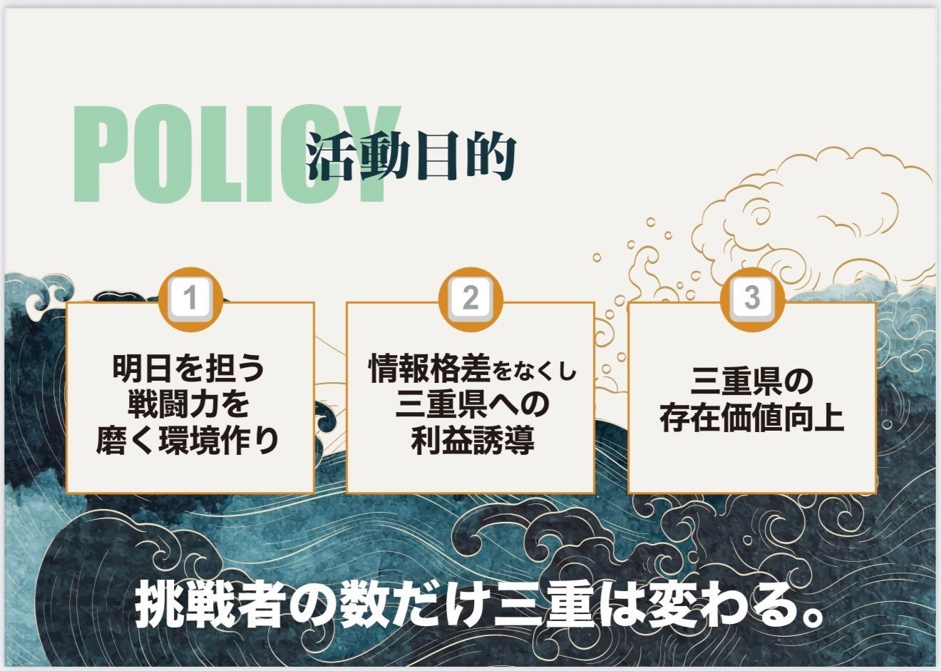 商才ある「三重県」という存在価値を高め、経営者同士が学ぶ・磨く・繋がる機会を創出し、地域の情報格差をなくして三重への利益を誘導することを目的としています。