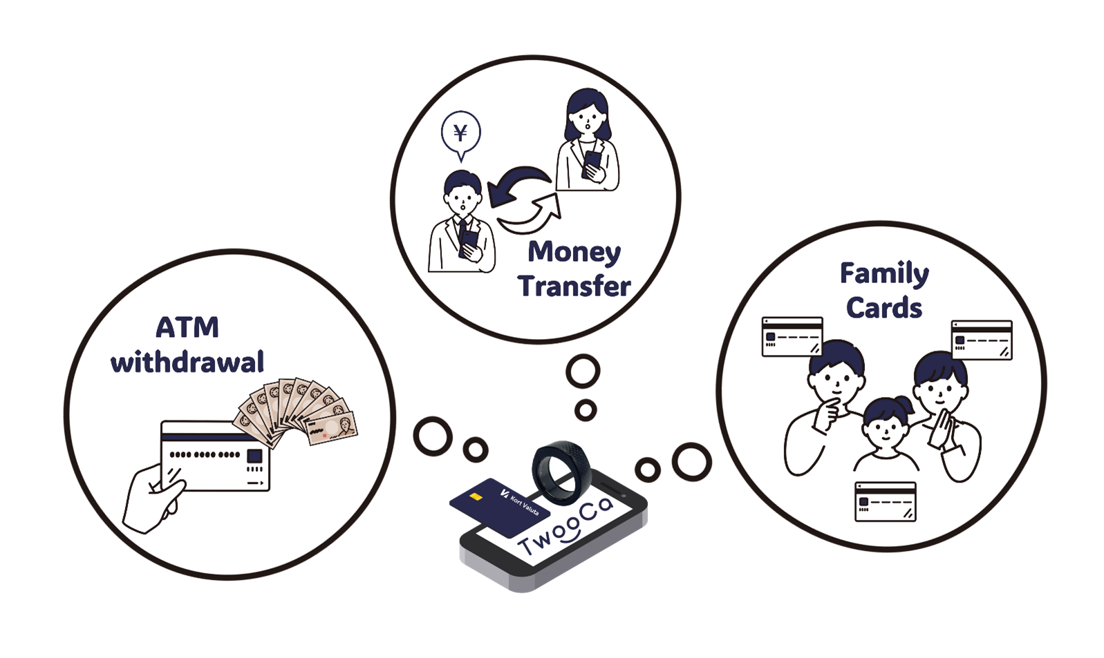 今後、当社サービス利用者は個人間の送金、そして自身でウォレットにチャージした金額を現金で引き出しすることが可能になります。ちょっとした現金が必要な時でも当社提携のセブン銀行ATMおよび登録の金融機関の口座から現金の引き出しを行うことが出来ます。従業員同士での個人間送金により、割り勘機能などの展開が可能になります。また、今後は家族カードの発行等を展開予定です。従業員の家族であればカード発行が可能になり、ご家族での支出管理、家族間送金(おこづかい送金)などの利用が可能になります。